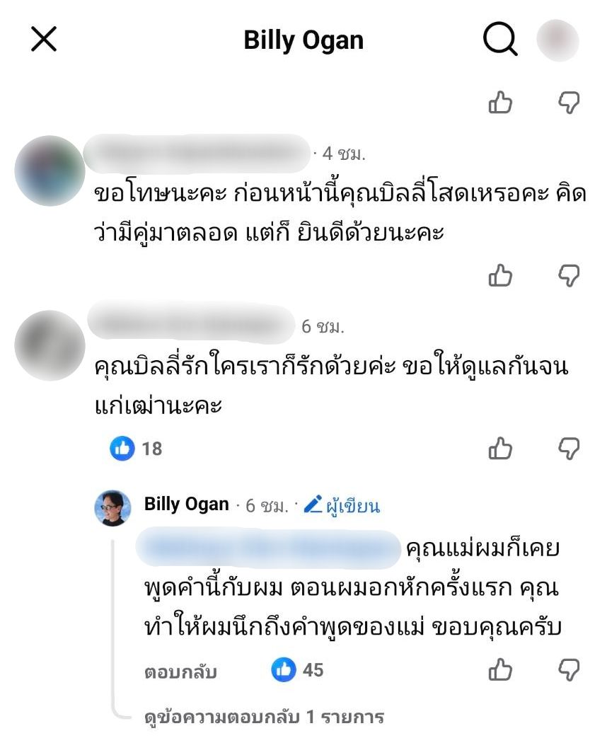 ซึ่งหลังจากที่โพสต์ภาพไปก็มีแฟนๆ คอมเมนต์แสดงความยินดีมากมาย และมีแฟนคลับรายหนึ่งที่คอมเมนต์ว่า “คุณบิลลี่รักใครเราก็รักด้วยค่ะ ขอให้ดูแลกันจนแก่เฒ่านะคะ” ซึ่งบิลลี่ก็ตอบกลับว่า “คุณแม่ผมก็เคยพูดคำนี้กับผม ตอนผมอกหักครั้งแรก คุณทำให้ผมนึกถึงคำพูดของแม่ ขอบคุณครับ”