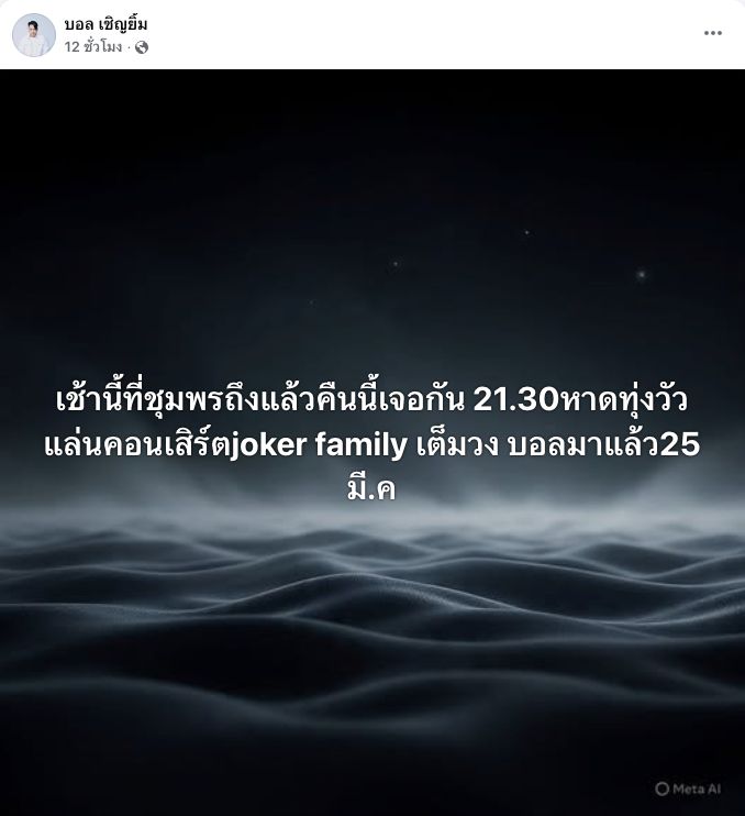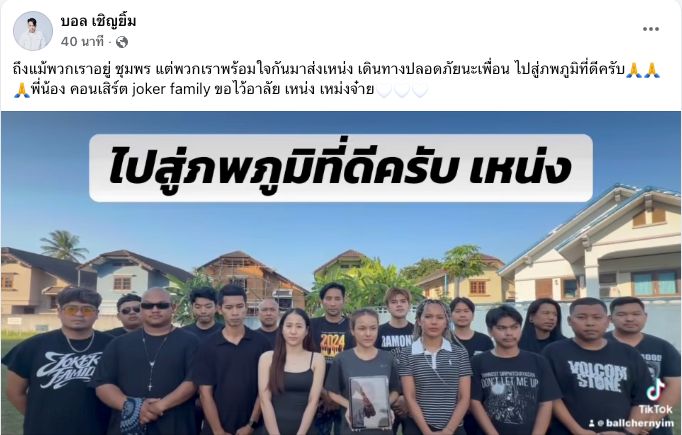 "ถึงแม้พวกเราอยู่ชุมพร แต่พวกเราพร้อมใจกันมาส่งเหน่ง เดินทางปลอดภัยนะเพื่อน ไปสู่ภพภูมิที่ดีครับพี่น้อง คอนเสิร์ต joker family ขอไว้อาลัย เหน่ง เหม่งจ๋าย"