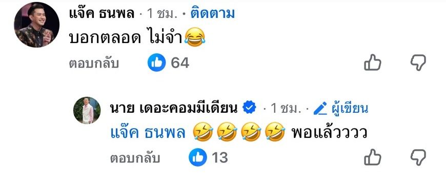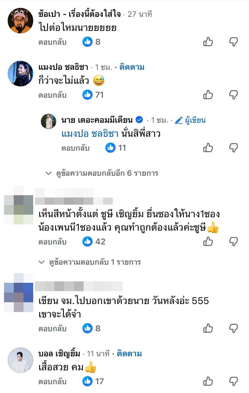 งานนี้เพื่อนๆ ในวงการก็ได้เข้ามาคอมเมนต์จำนวนมาก อาทิ แมงปอ ชลธิชา เขียนว่า “ก็ว่าจะไม่แล้ว”, บอล เชิญยิ้ม เขียนว่า “เสื้อสวย คม”, แจ็ค ธนพล ก็ได้คอมเมนต์ว่า “บอกตลอด ไม่จำ” รวมถึงเพื่อนอีกคนของนายเขียนว่า "555555 คันปากเน้อ" ซึ่ง นาย ก็ได้ตอบกลับว่า "แหมมมม ผมอยากจะเล่าใจจะขาดละแม่จ๋าาาา"