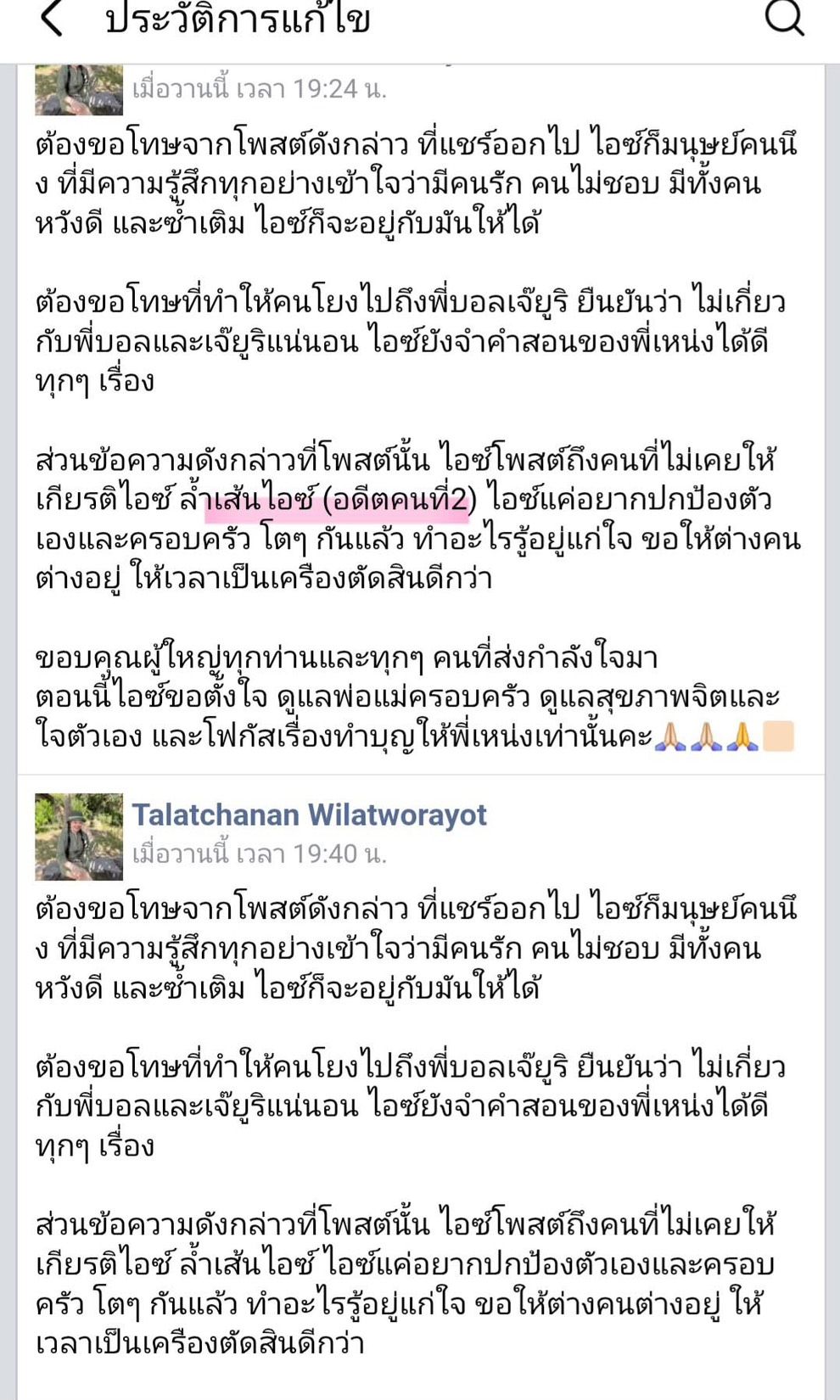 ล่าสุดได้มีคนตาดีเข้าไปส่องประวัติการแก้ไขข้อความดังกล่าวที่ ไอซ์ ได้โพสต์ พบว่า ไอซ์ได้เขียนวงเล็บว่า "(อดีตคนที่ 2)" ก่อนจะแก้ไขใหม่และลบข้อความนี้ออกไป เห็นได้ชัดเลยว่า ข้อความก่อนหน้านี้ที่ไอซ์โพสต์ฟาดนั้นหมายถึงใคร