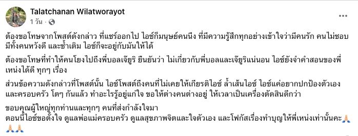 จากนั้น ไอซ์ ก็ได้ลบโพสต์ดังกล่าวออกไป ก่อนจะโพสต์ขอโทษที่ทำให้คนโยงไปถึงบอลกับยูริ และยังบอกอีกว่า ที่โพสต์ออกไปนั้น โพสต์ถึงคนที่ไม่ให้เกียรติ แค่อยากปกป้องตัวเองและครอบครัว โตๆ กันแล้ว