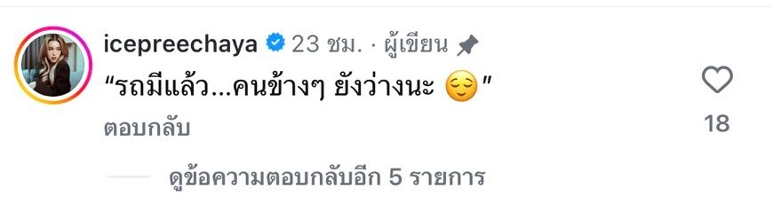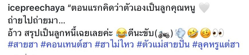 "ตอนแรกคิดว่าตัวเองเป็นลูกคุณหนู ถ่ายไปถ่ายมา…อ้าว สรุปเป็นลูกหนี้เฉยเลยค่ะ ดีนะขับ (อิโมจิรูปมอเตอร์ไซด์)" จากนั้นก็เขียนเพิ่มเติมในคอมเมนต์ว่า “รถมีแล้ว…คนข้างๆ ยังว่างนะ"