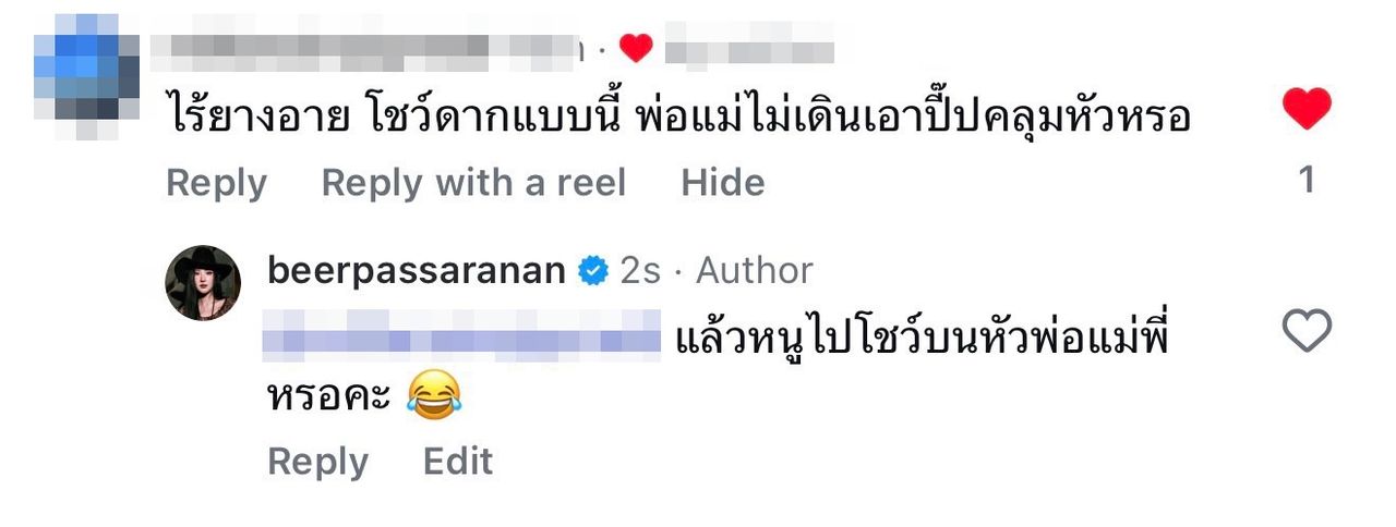 เจ้าตัวสวนกลับฉบับตัวมัม มีหรือคนอย่าง เบียร์ เดอะวอยซ์ จะยอมอยู่เฉยๆ เจ้าตัวตอกกลับนิ่มๆ แต่เจ็บลึกถึงทรวงชนิดที่คนอ่านยังหงายหลังว่า "แล้วหนูไปโชว์บนหัวพ่อแม่พี่เหรอคะ”