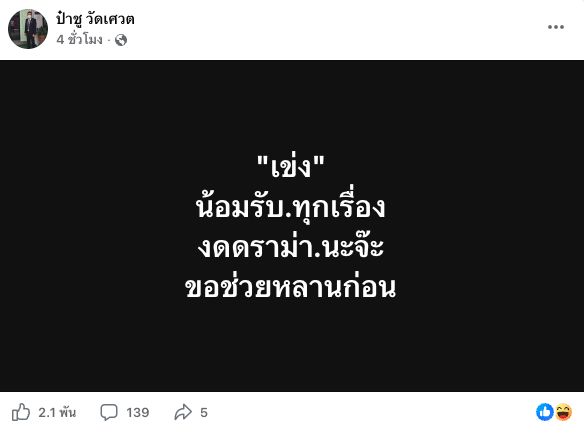 นอกจากนี้ ป๋าชูยังโพสต์ข้อความถึงตัวละคร “เข่ง” ที่ตนเองเล่าไปก่อนหน้านี้ไว้ว่า “"เข่ง"น้อมรับ.ทุกเรื่องงดดราม่า.นะจ๊ะขอช่วยหลานก่อน”