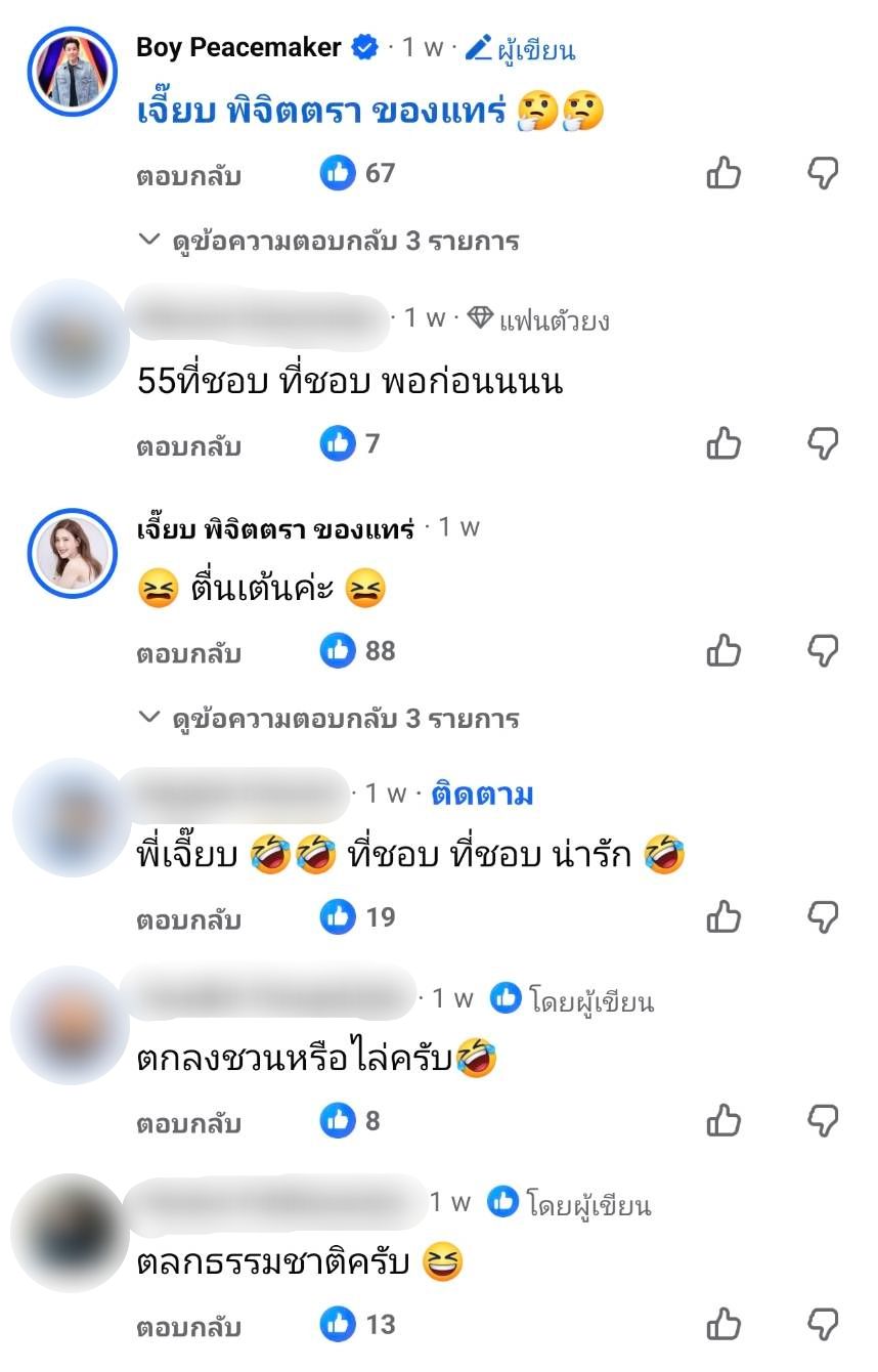 ทำเอาคุณภรรยาอย่างเจี๊ยบก็คอมเมนต์ตอบกลับว่า “ตื่นเต้นค่ะ” และใส่อีโมจิหลับตาปี๋ด้วยความอาย ส่วนแฟนๆ แห่คอมเมนต์แซวรัวๆ เลยทีเดียว