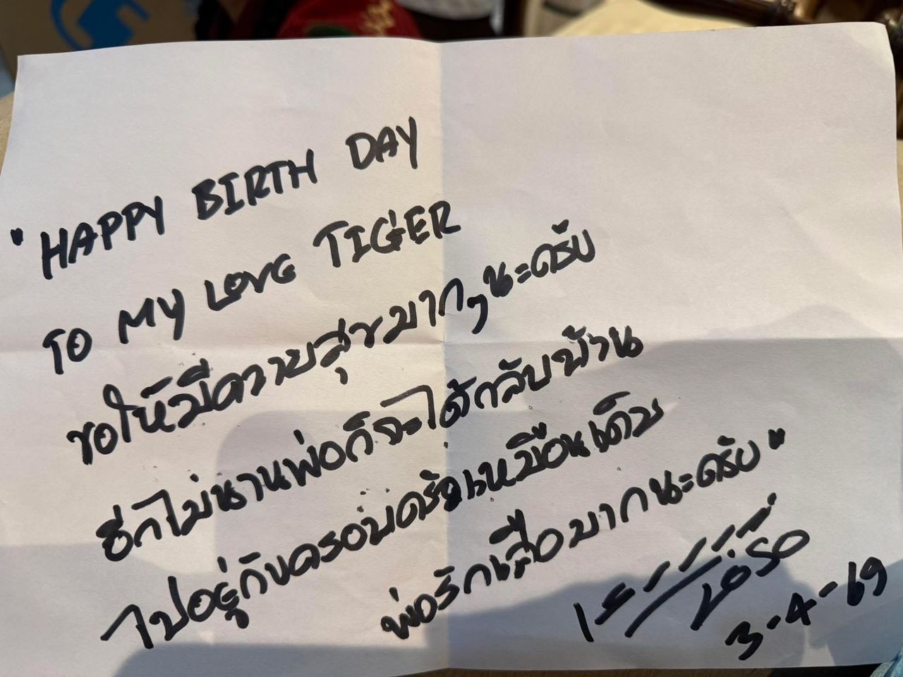 “ปีนี้ พ่อทำให้ลูกได้เท่านี้ ทั้งๆที่อยากอยู่กับลูกๆในวันครบรอบวันเกิดคืนนี้ จึงฝากลายมือพ่อไปพร้อมกับแม่ รักลูกๆทั้ง 3 มากที่สุด”