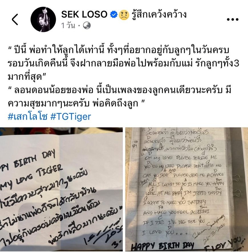 อีกไม่กี่เดือนก็จะได้ออกจากเรือนจำแล้ว สำหรับ เสก โลโซ ล่าสุดในเฟซบุ๊กแฟนเพจ SEK LOSO ก็ได้โพสต์ภาพจดหมายน้อยที่เขียนด้วยลายมือของ เสก โลโซ ส่งถึงลูกๆ ทั้ง 3 คนในวันเกิด ที่ในปีนี้จะไม่ได้อยู่ด้วยกัน แต่พ่อเสกก็ไม่เคยลืมวันเกิดของลูกๆ และได้ฝากความในใจเขียนด้วยลายมือตัวเอง ส่งไปกับแม่