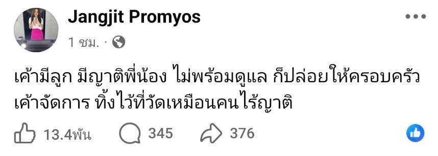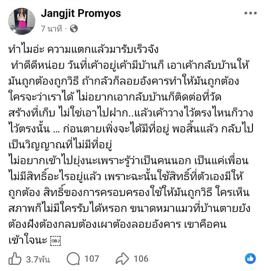 ล่าสุด แจง เมียแจ๊ส โพสต์ข้อความในเฟซบุ๊กอีกครั้ง โดยบอกว่า “ทำไมอ่ะ ความแตกแล้วมารับเร็วจัง ทำดีดีหน่อย วันที่เค้าอยู่ เค้ามีบ้านก็เอาเค้ากลับบ้านให้มันถูกต้องถูกวิธี ถ้ากลัวก็ลอยอังคารทำให้มันถูกต้องใครจะว่าเราได้ ไม่อยากเอากลับบ้านก็ติดต่อที่วัด