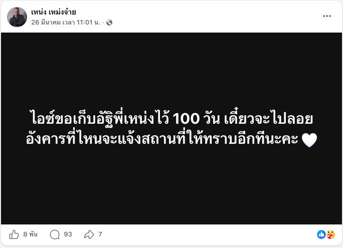 พร้อมโพสต์ภาพรับอัฐิ เหน่ง เหม่งจ๋าย พร้อมโพสต์ “หนูคิดถึงที่รักนะ คิดถึงมากที่สุด ไอซ์ขอเก็บอัฐิพี่เหน่งไว้ 100 วัน แล้วจะแจ้งสถานที่ลอยอังคารอีกทีนะคะทุกท่าน”