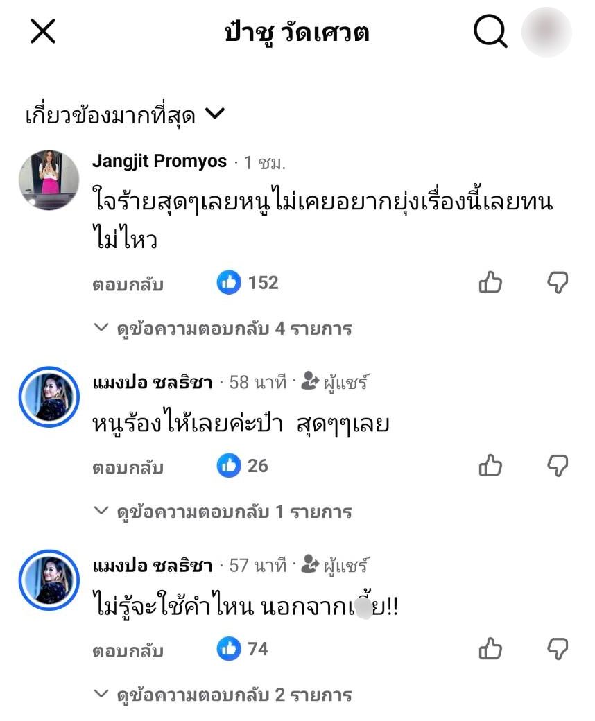 แจง ยังได้เข้าไปคอมเมนต์ ขณะที่ป๋าชูไลฟ์ถึงประเด็นนี้ว่า “ใจร้ายสุดๆ เลยหนูไม่เคยอยากยุ่งเรื่องนี้เลยทนไม่ไหว” ขณะที่แมงปอ ชลธิชา คอมเมนต์ว่า "หนูร้องไห้เลยค่ะป๋า สุดๆๆ เลย ไม่รู้จะใช้คำไหน นอกจากเxี้ย"
