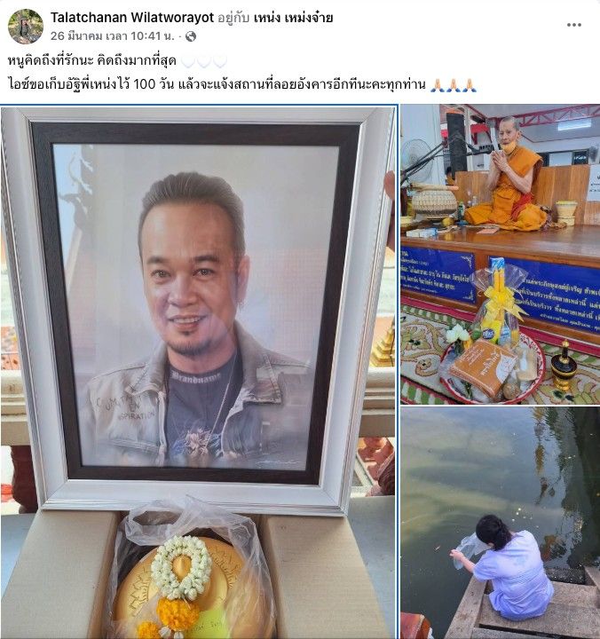 และเมื่อกลับไปเช็กในโซเชียลมีเดียของ ไอซ์ ถลัชนันท์ ภรรยาเหน่ง เหม่งจ๋าย เคยโพสต์ไว้ว่า “ไอซ์ขอเก็บอัฐิพี่เหน่งไว้ 100 วัน เดี๋ยวจะไปลอยอังคารที่ไหนจะแจ้งสถานที่ให้ทราบอีกทีนะคะ”