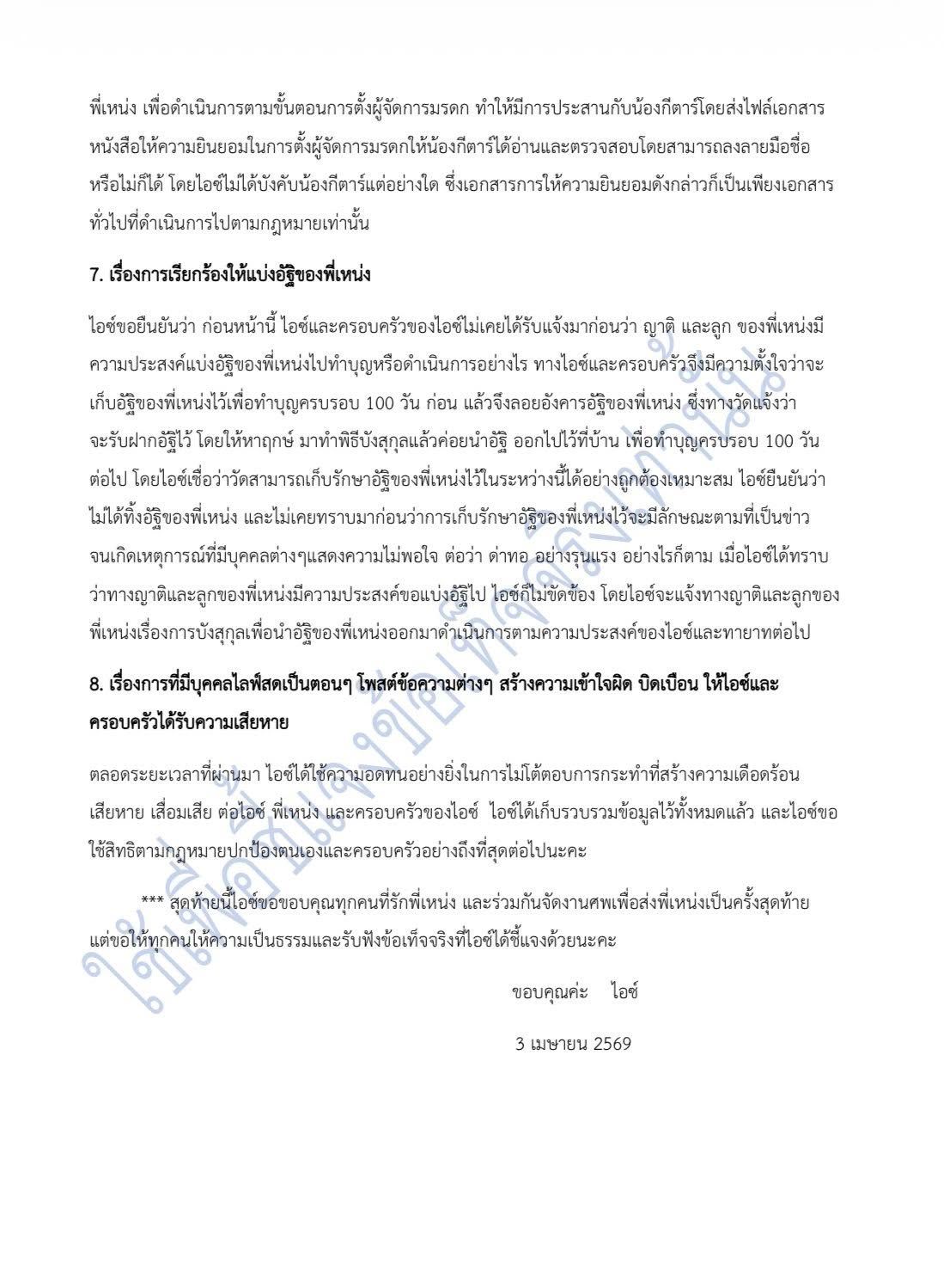 เนื่องจากพี่เหน่งมีภาระหนี้สินเรื่องบ้านและรถยนต์ที่ต้องมีการผ่อนชำระต่อไป การตั้งผู้จัดการมรดกของพี่เหน่งก็เพื่อเคลียร์ภาระหนี้สินเป็นหลัก ไม่ใช่การทำเพื่อให้ไอซ์ได้มรดกของพี่เหน่งคนเดียว ไอซ์ทราบดีว่าถึงไอซ์จะเป็นภรรยาและจดทะเบียนสมรส แต่พี่เหน่งก็มีลูก ไอซ์ไม่เคยปฏิเสธสิทธิของใครในการรับมรดกของพี่เหน่ง เพื่อดำเนินการตามขั้นตอนการตั้งผู้จัดการมรดก ทำให้มีการประสานกับน้องกีตาร์โดยส่งไฟล์เอกสารหนังสือให้ความยินยอมในการตั้งผู้จัดการมรดกให้น้องกีตาร์ได้อ่านและตรวจสอบโดยสามารถลงลายมือชื่อหรือไม่ก็ได้