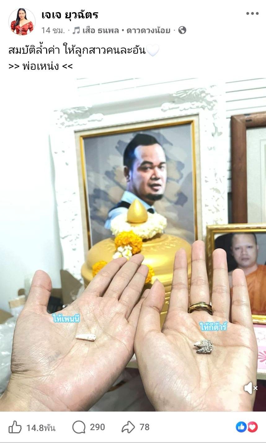 นอกจากนี้ เจเจ ยุวฉัตร ยังโพสต์ภาพอัฐิของเหน่ง เหม่งจ๋าย โดยแบ่งให้ น้องเพนนี และ กีตาร์ พัชรามญชุ์ มีมาก ลูกสาวคนโตของเหน่งกับอดีตภรรยาคนแรก พร้อมทั้งเขียนข้อความว่า “สมบัติล้ำค่า ให้ลูกสาวคนละอัน >> พ่อเหน่ง <<”