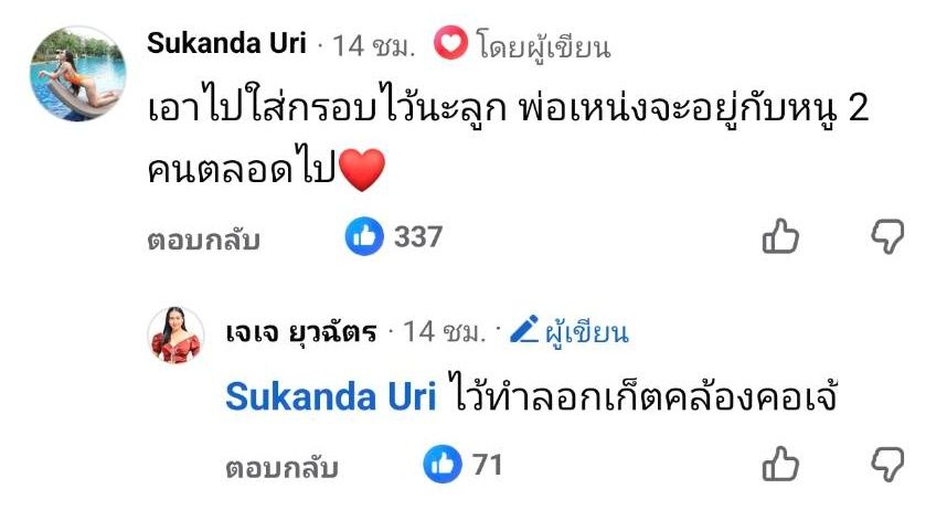 ด้าน ยูริ ภรรยาบอล เชิญยิ้ม ก็คอมเมนต์บอกว่า “เอาไปใส่กรอบไว้นะลูก พ่อเหน่งจะอยู่กับหนู 2 คนตลอดไป” ในขณะที่เจเจก็ตอบกลับว่า “ไว้ทำลอกเก็ตคล้องคอเจ้”