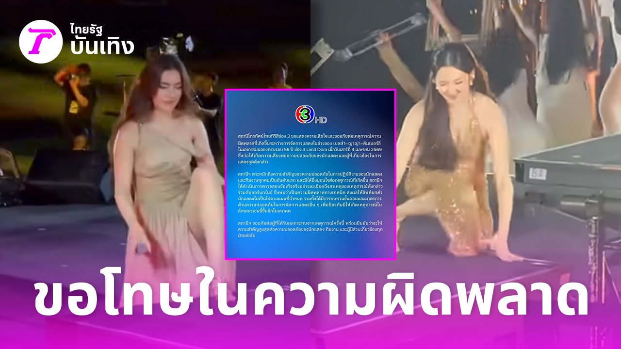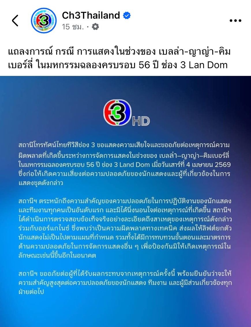 สถานีโทรทัศน์ไทยทีวีสีช่อง 3 ขอแสดงความเสียใจและขออภัยต่อเหตุการณ์ความผิดพลาดที่เกิดขึ้นระหว่างการจัดการแสดงในช่วงของ เบลล่า-ญาญ่า-คิมเบอร์ลี่ ในมหกรรมฉลองครบรอบ 56 ปี ช่อง 3 Land Dom เมื่อวันเสาร์ที่ 4 เมษายน 2569 ซึ่งก่อให้เกิดความเสี่ยงต่อความปลอดภัยของนักแสดงและผู้ที่เกี่ยวข้องในการแสดงชุดดังกล่าว