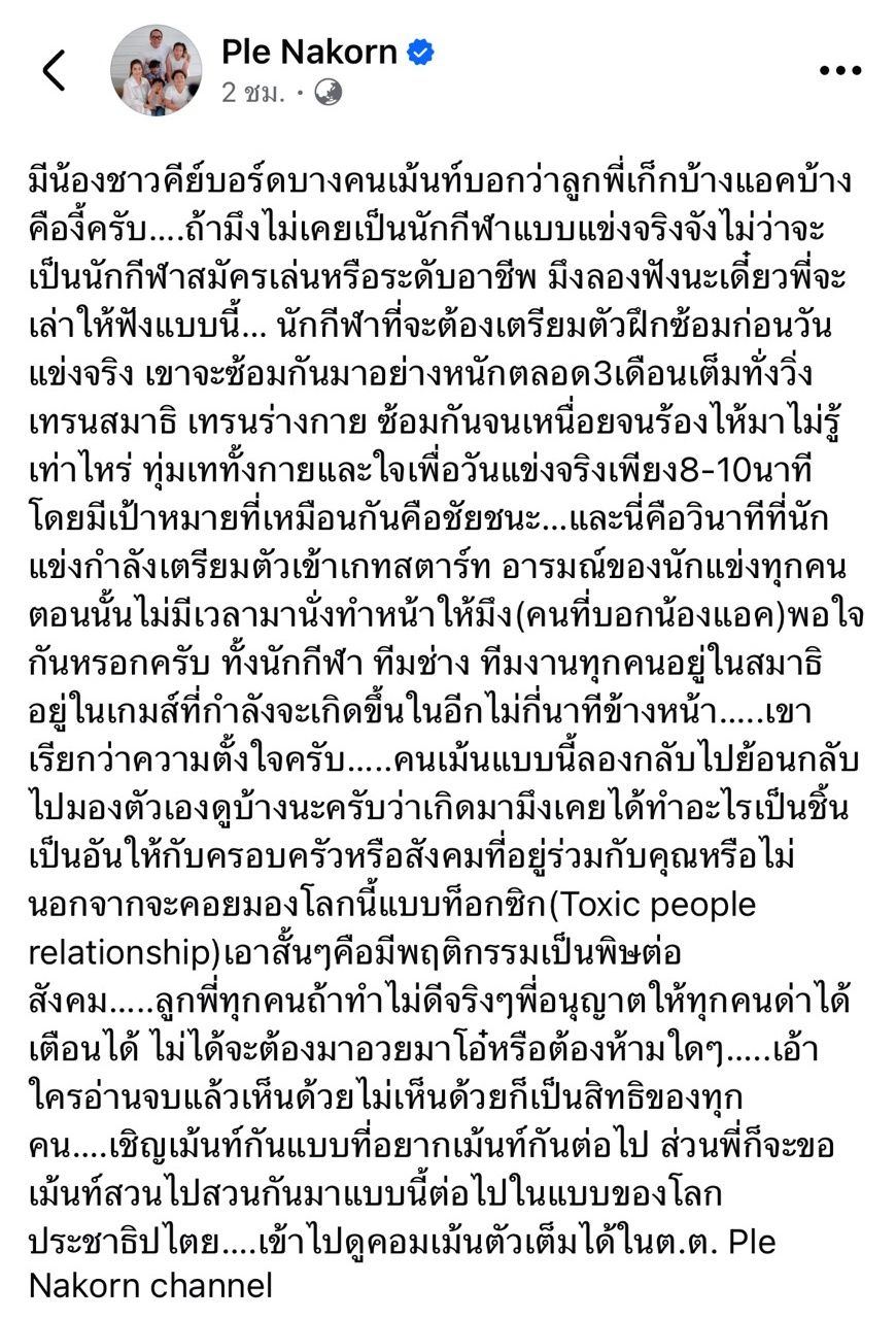 แต่มีคอมเมนต์หนึ่งที่เข้ามาเขียนว่า “ทำไมมองว่าแอค” งานนี้ทำเอาคนเป็นพ่อถึงกับเดือดทันที จากนั้น พ่อเปิ้ล ก็ได้แคปข้อความดังกล่าว และโพสต์เขียนว่า นักกีฬาเขาทุ่มฝึกซ้อมกันมาอย่างหนัก ไม่รู้ร้องไห้ไปกี่ครั้ง เพื่อแข่งจริงเพียงไม่กี่นาที อารมณ์ในตอนนั้นไม่มีเวลามานั่งทำหน้าให้คนพอใจหรอก พร้อมฟาดกลับถึงเกรียนคีย์บอร์ดคนนั้นว่า เกิดมาเคยทำอะไรเป็นชิ้นเป็นอันมั้ย นอกจากคอยมองโลกแบบท็อกซิกอย่างนี้