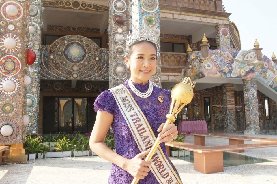 การถวายมงกุฎ คฑา และสายสะพายให้กับวัดเพื่อเป็นพุทธบูชา ได้มามันก็อยู่ในตู้ เราเดินไปเดินมา 21 ปีแล้ว เดินผ่านไปผ่านมา วันหนึ่งก็คิดขึ้นมาได้ว่า ลูกเราเขาไม่ได้อินตรงนี้ เขารับทราบว่าแม่เป็นมิสไทยแลนด์เวิลด์ปีโน้นปีนี้ แต่ว่าของที่เรามีอยู่ เขาไม่ได้อิน ก็ไม่มีประโยชน์อะไรที่จะตั้งไว้ ก็เลยนำไปถวายเป็นพุทธบูชา ที่วัดพระธาตุผาซ่อนแก้ว มงกุฎ คฑา และสายสะพาย ปีนั้นได้ขวัญใจช่างภาพด้วย ก็เอาไว้ที่วัดนั่นหมดเลย