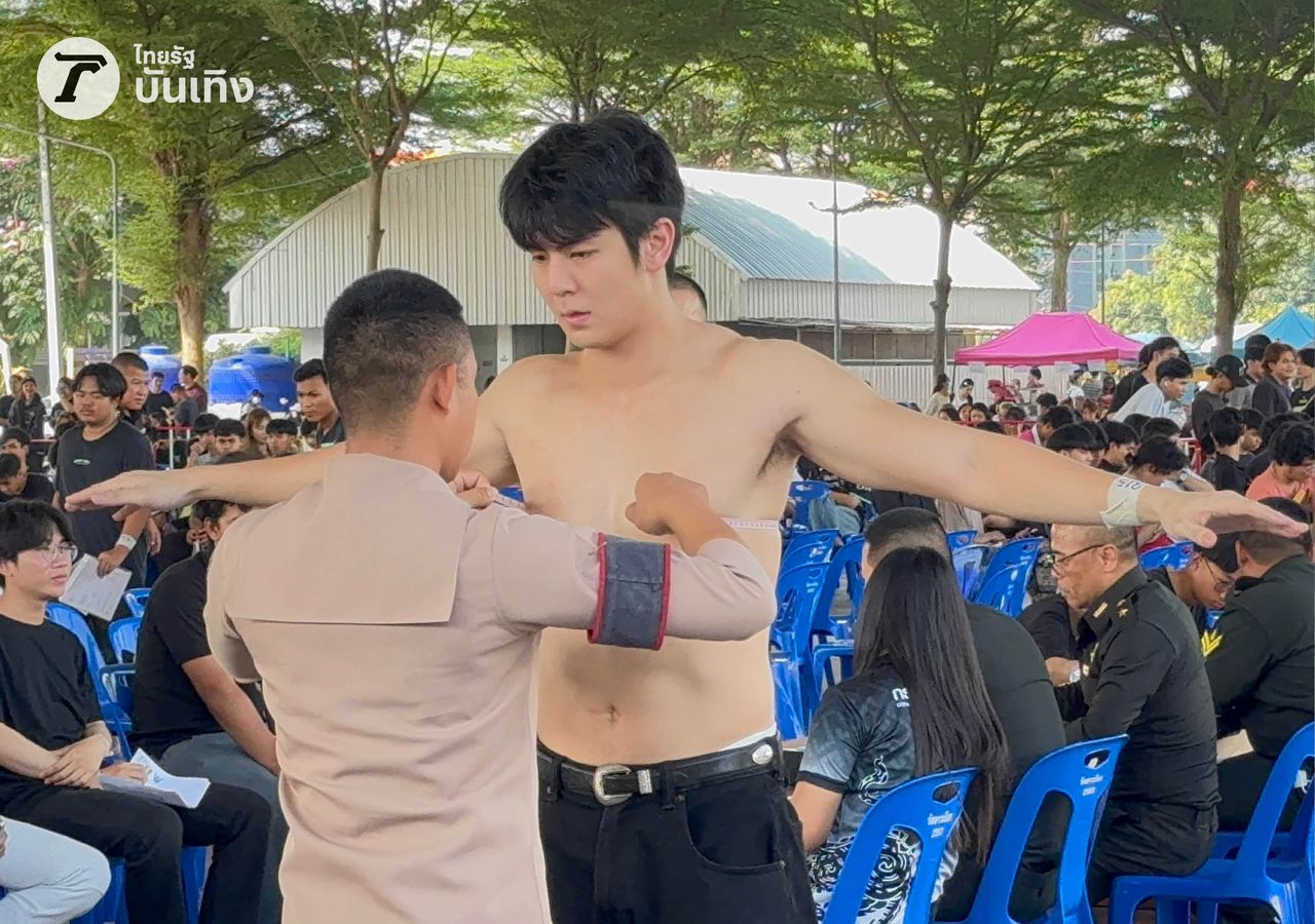 วันนี้ (8 เมษายน 2569 ) บริเวณโดม ภายในศูนย์ประชุมและฝึกอบรมวิชาชีพ วิทยาลัยการอาชีวศึกษาปทุมธานี ตำบลบางพูน อำเภอเมือง จังหวัดปทุมธานี เป็นสถานที่ในการตรวจเลือกทหารกองเกินเข้ารับราชการทหารกองประจำการ ประจำปี 2569 เป็นวันที่ 2 ของชายไทยที่อยู่ในเขตพื้นที่อำเภอเมืองปทุมธานี บรรยากาศภายในสถานที่ตรวจเลือกเป็นไปอย่างคึกคัก มีชายไทยที่ถึงเกณฑ์เข้ารับการตรวจเลือกทยอยเดินทางมาตั้งแต่ช่วงเช้า โดยมีเจ้าหน้าที่คอยอำนวยความสะดวกและดำเนินขั้นตอนตามระเบียบอย่างเคร่งครัด ขณะที่ “ริว วชิรวิชญ์ วัฒนภักดีไพศาล” นักแสดงชื่อดัง ได้รับความสนใจจากประชาชนและสื่อมวลชนที่มารอติดตามข่าวจำนวนมาก