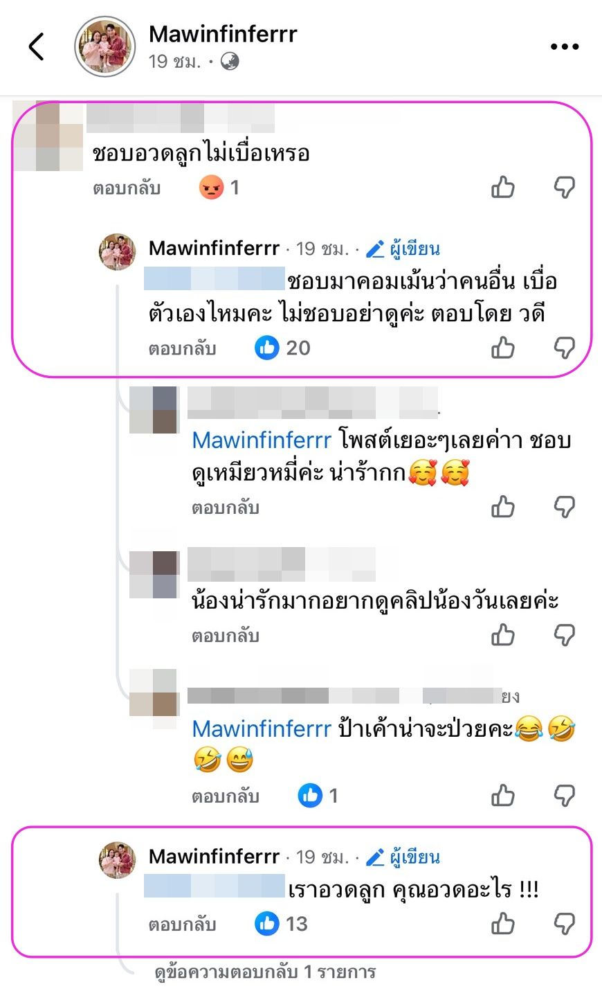 แต่ล่าสุดอยู่ดีๆ ก็กลายเป็นดราม่าซะงั้น เพราะได้มีคนเข้ามาคอมเมนต์แซะว่า “ชอบอวดลูกไม่เบื่อเหรอ” งานนี้ แม่ตู่ไม่รอช้า ตอบกลับทันทีบอกว่า “ชอบมาคอมเมนต์ว่าคนอื่น เบื่อตัวเองไหมคะ ไม่ชอบอย่าดูค่ะ เราอวดลูก คุณอวดอะไร ตอบโดย วดี” และ “เราอวดลูก คุณอวดอะไร !!!”