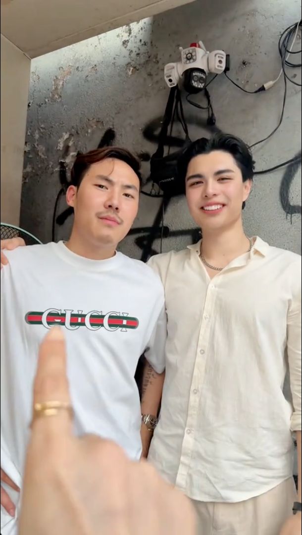 จากนั้นหนุ่มน้อยคนนี้ก็พูดทักทายทุกคนเป็นภาษาไทยและภาษาอังกฤษ ช็อตนี้ตะลึงไปเลยเพราะเป็นหนุ่มน้อยที่หล่อมาก แถมยิ้มมีเสน่ห์สุดๆ งานนี้แพทบอกให้พีและญาติหนุ่มหล่อคนนี้ยืนเทียบกันว่าเหมือนกันมั้ย ก่อนที่แพทจะชี้ไปที่สามีตัวเองและบอกว่า “ไอ้นี่คือคนขับรถ” ก่อนจะชี้ไปที่ญาติพ่อพีและบอกว่า “อันนี้คือบ้านผู้ดีที่เขาจ้างคุณมา” แพทขยี้ต่อ ชี้ไปที่พ่อพีอีกรอบแล้วบอกว่า “แล้วที่ใส่เสื้อกุชชี่คือเสี้อของคนนี้ (ชี้ไปที่ญาติของพี) เขาให้ยืม” ก่อนที่จะบอกใ่ห้ทุกคนคอมเมนต์มา 2 คนนี้เขาเป็นญาติกัน คุณเชียร์ฝั่งไหน