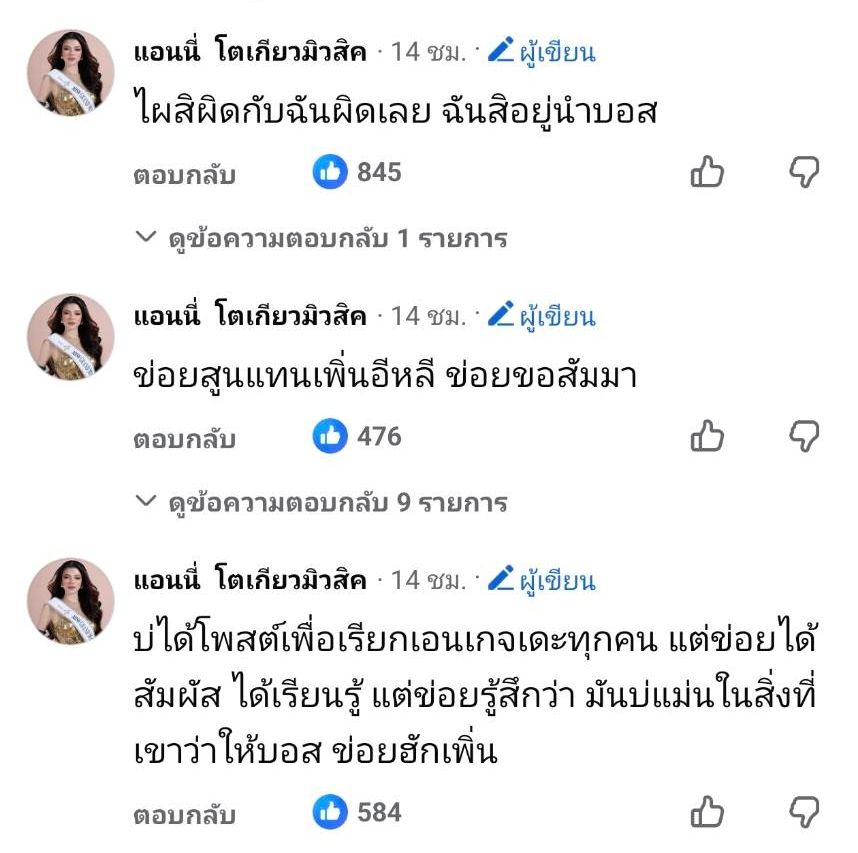 ก่อนจะคอมเมนต์เพิ่มเติมใต้โพสต์ดังกล่าวว่า “ไผสิผิดกับฉันผิดเลย ฉันสิอยู่นำบอส” รวมถึงข้อความ “ข่อยสูนแทนเพิ่นอีหลี ข่อยขอสัมมา” พร้อมทั้งยืนยันว่าไม่ได้โพสต์หาเอ็นเกจเมนต์ โดยบอกว่า “บ่ได้โพสต์เพื่อเรียกเอนเกจเดะทุกคน แต่ข่อยได้สัมผัส ได้เรียนรู้ แต่ข่อยรู้สึกว่า มันบ่แม่นในสิ่งที่เขาว่าให้บอส ข่อยฮักเพิ่น”