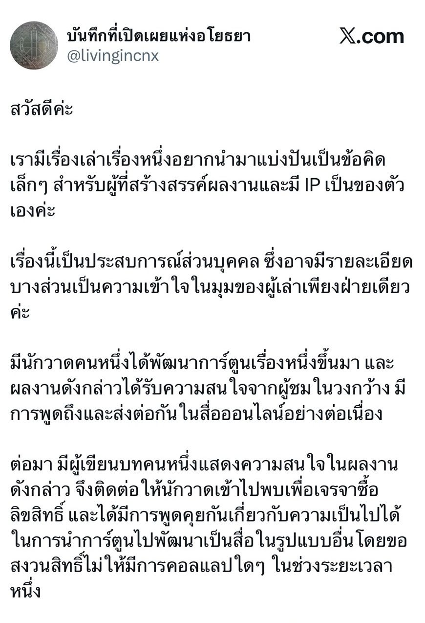 - วันที่ 12 เม.ย. 2569 บัญชี “บันทึกที่เปิดเผยแห่งอโยธยา” โพสต์ข้อความลง X เล่ายาวเรื่องของนักวาดการ์ตูนชื่อดังคนหนึ่ง ที่ได้มีนักเขียนบทติดต่อขอซื้อลิขสิทธิ์การ์ตูน “อโยธยาเอยาวดี” เพื่อนำไปพัฒนาเป็นสื่อในรูปแบบอื่นโดยขอสงวนสิทธิ์ไม่ให้มีการคอลแลปใดๆ ในช่วงระยะเวลาหนึ่ง