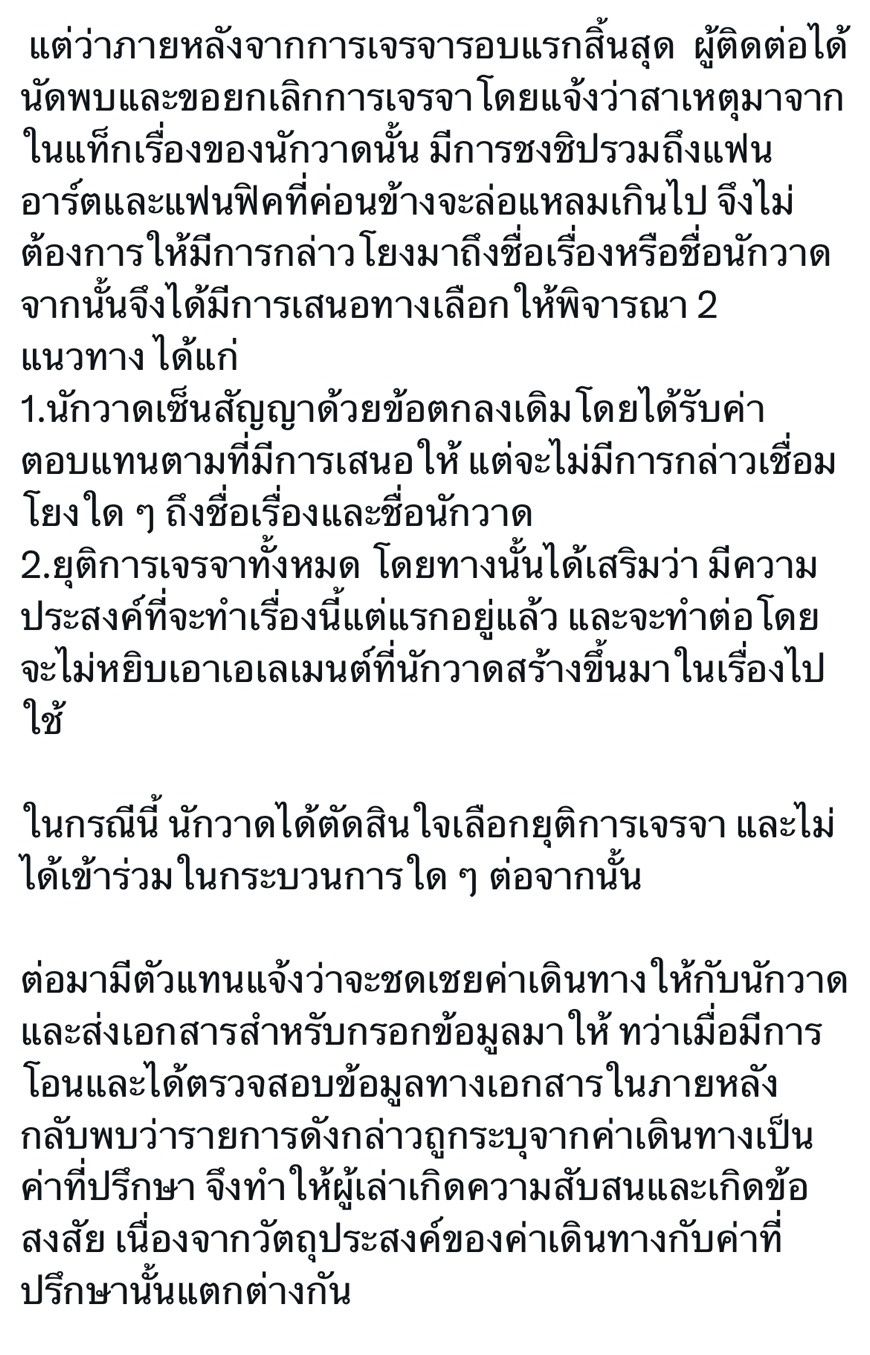 - ต่อมามีตัวแทนแจ้งว่า จะชดเชยค่าเดินทางให้กับนักวาดและส่งเอกสารสำหรับกรอกข้อมูลมาให้ แต่เมื่อมีการโอนและได้ตรวจสอบข้อมูลทางเอกสารในภายหลัง กลับพบว่ารายการดังกล่าวถูกระบุจาก “ค่าเดินทางเป็นค่าที่ปรึกษา” จึงทำให้นักวาดการ์ตูนเกิดความสับสนและเกิดข้อสงสัย เพราะวัตถุประสงค์ค่าเดินทางกับค่าที่ปรึกษานั้นแตกต่างกัน