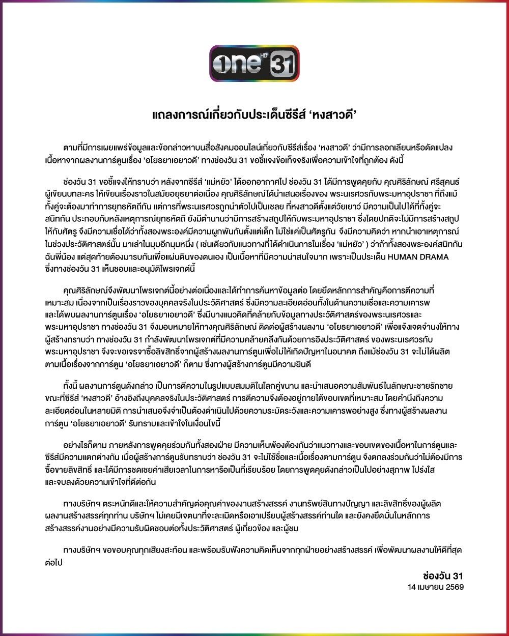 - ล่าสุดทาง ช่องวัน 31 ได้ออกแถลงการณ์กลางดึกเกี่ยวกับประเด็นซีรีส์ “หงสาวดี” โดยยืนยันว่า ซีรีส์อิงประวัติศาสตร์จริง ไม่ได้คัดลอกการ์ตูน “อโยธยาเอยาวดี” แต่อย่างใด