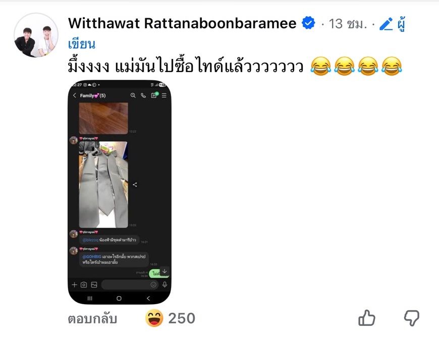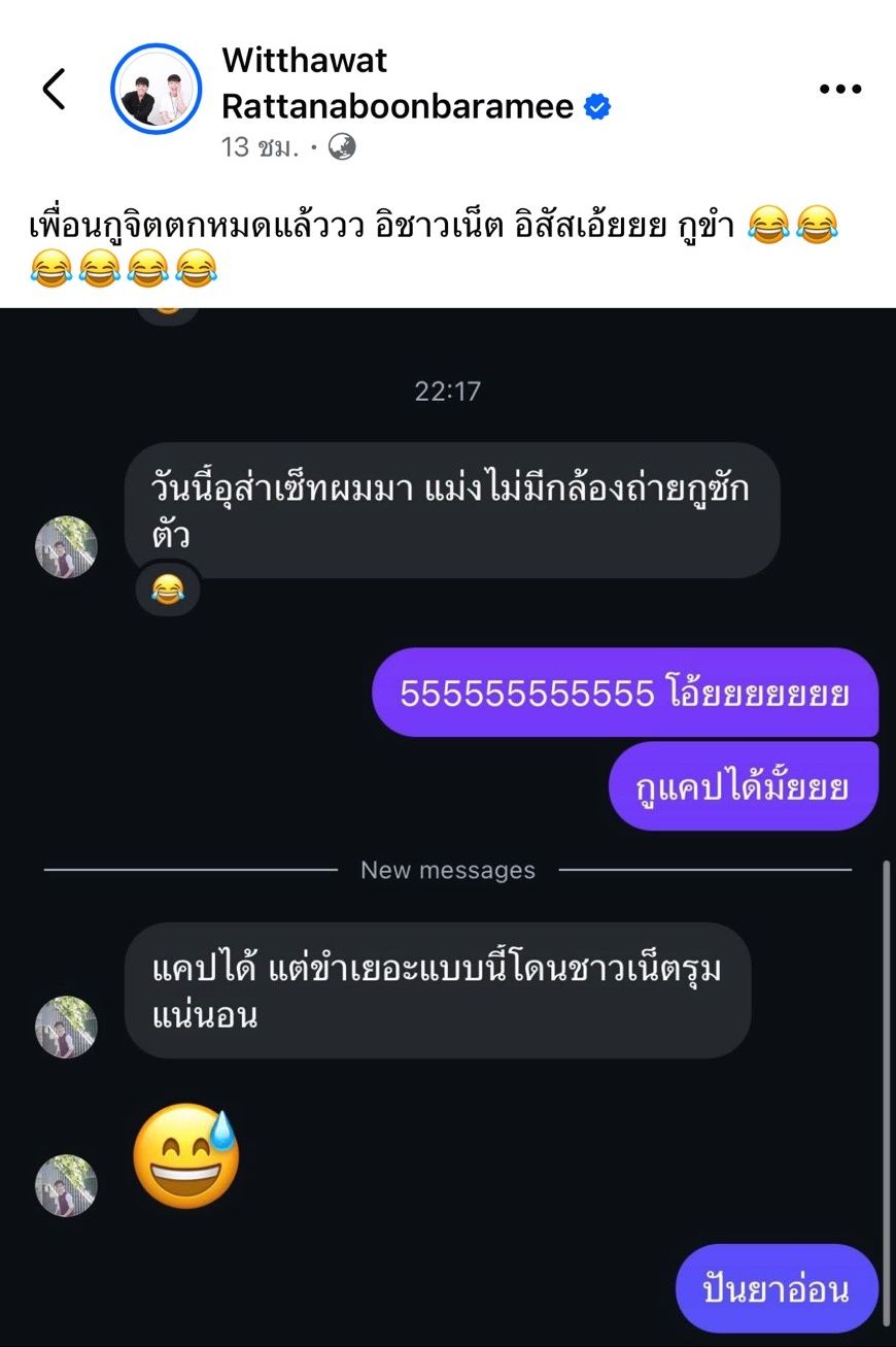 ล่าสุด เอม วิทวัส เพื่อนสนิททั้ง จ๊ะ และ บิ๊ก ก็ได้เผยแชตที่ บิ๊ก ส่งข้อความมาหา บอกว่า อุตส่าห์เซ็ตผมมางานอย่างหล่อ แต่ไม่มีกล้องมาถ่ายเลยสักตัว ด้าน เอม ก็บอกว่า เพื่อนจิตตกไปหมดแล้ว และยังเผยแชตที่ทางแม่ของ บิ๊ก ถึงขั้นเตรียมเนกไท สเปรย์เซ็ตผมให้เลย