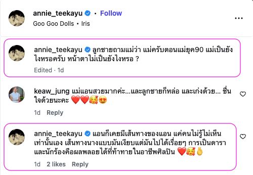 ล่าสุด แม่แอนนี่ ได้โพสต์คลิปเป็นรูปภาพเมื่อครั้งสมัยยังสาวๆ และเขียนแคปชั่นเล่าว่า “ลูกชายถามแม่ว่า แม่ครับตอนแม่ยุค90 แม่เป็นยังไงหรอครับ หน้าตาแม่เป็นยังไงหรอ?”