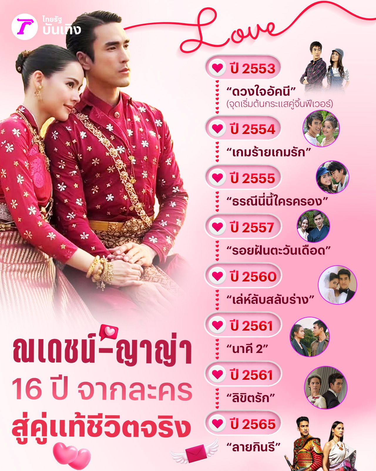 สำหรับเส้นทางความรักของ ณเดชน์ กับ ญาญ่า เดินทางมายาวนานกว่า 16 ปี เริ่มต้นจากคู่จิ้นในละคร จนกระทั่งมาเป็นคู่ชีวิตของกันและกัน