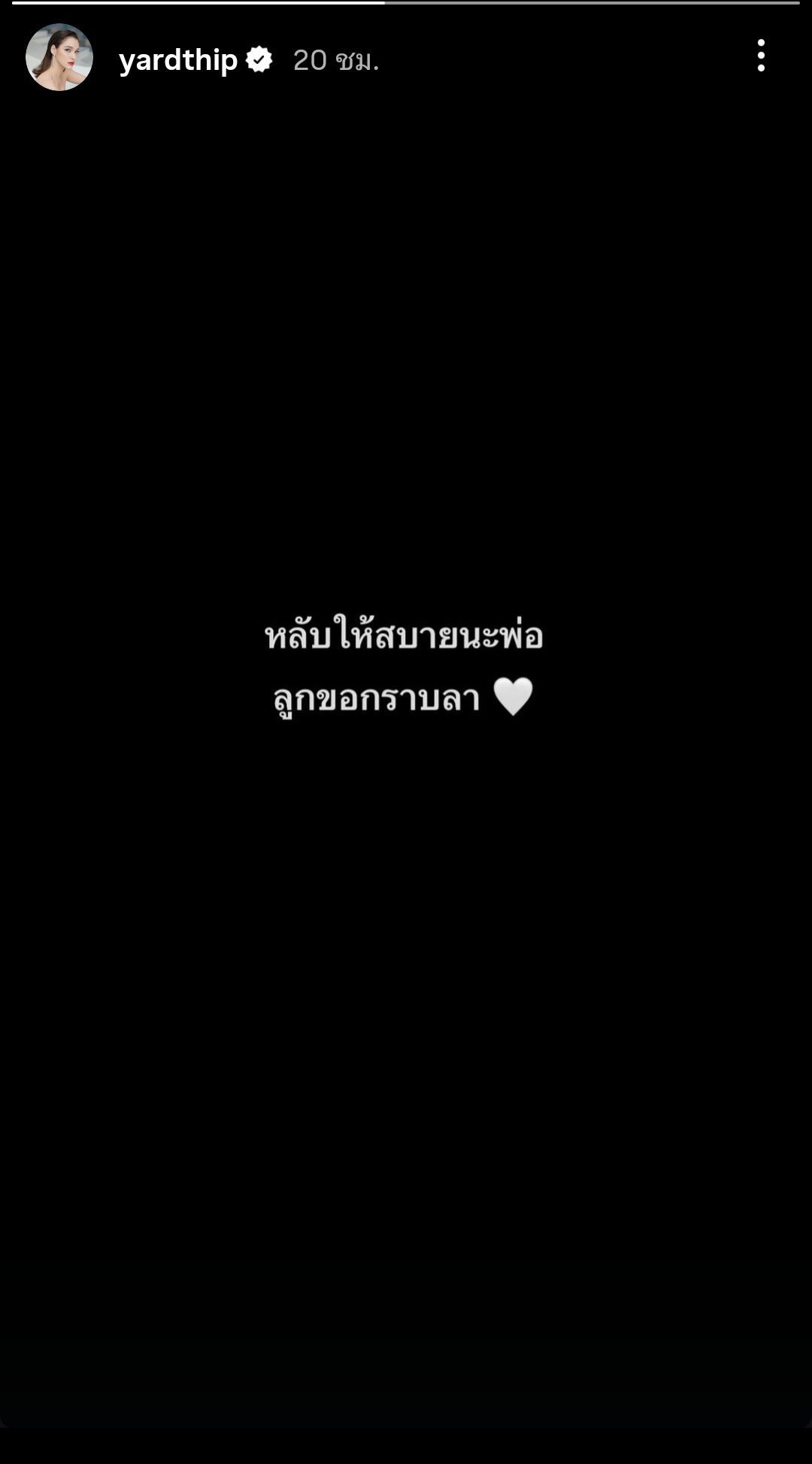 ทางด้านหยาดทิพย์ได้โพสต์ภาพผ่านไอจีสตอรี่ ซึ่งเป็นภาพบรรยากาศภายในงานศพที่คุณพ่อจากไป พร้อมระบุข้อความสั้นๆ แต่เปี่ยมไปด้วยความรักและความอาลัยว่า หลับให้สบายนะพ่อ ลูกขอกราบลา🤍