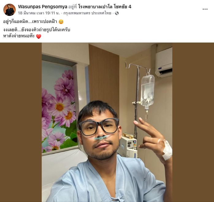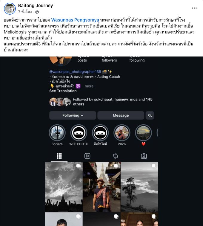 “ขอแจ้งข่าวการจากไปของ Wasunpas Pengsomya นะคะ ก่อนหน้านี้ได้ทำการเข้ารับการรักษาที่โรงพยาบาลในจังหวัดกำแพงเพชร เพื่อรักษาอาการติดเชื้อแบคทีเรีย ในตอนแรกที่ทราบคือ โรคไข้ดินจากเชื้อ Melioidosis รุนแรงมาก ทำให้ปอดเสียหายหนักและเกิดภาวะช็อกจากการติดเชื้อซ้ำ คุณหมอจะปรับยาและพยายามยื้ออย่างเต็มที่แล้ว