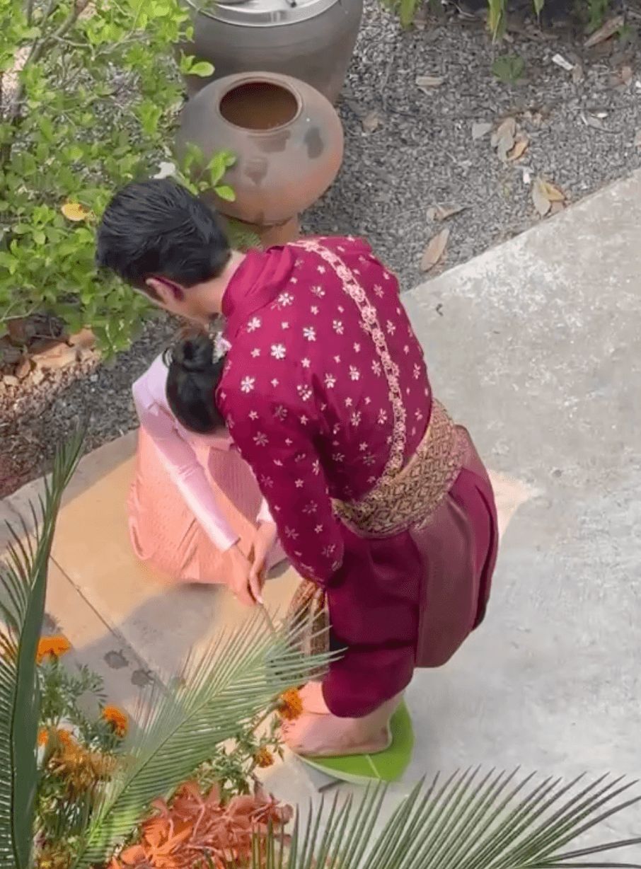 เมื่อถามว่า คนกัมพูชาบอกว่า ปกติเราจะนั่งรดน้ำสังข์ที่เก้าอี้ แต่ในงานแต่ง ณเดชน์-ญาญ่า ไปนั่งพื้น เราไปเลียนแบบเขา เรื่องนี้ พ่อเอ๊ะ ตั้งข้อสงสัยว่า เป็นเพราะ ณเดชน์-ญาญ่า เป็นคนดังรึเปล่า เลยทำให้คนกัมพูชาโฟกัสที่คนดัง เพราะปกติในงานแต่งงาน ไม่ว่าจะเป็นคนธรรมดา หรือดารา ถ้าจัดงานในโรงแรมก็ต้องเป็นพิธีแบบสากล นั่งโต๊ะแล้วก็รดน้ำสังข์ แต่ประเพณีอีสานซึ่งเป็นประเพณีพื้นบ้าน เขาก็จะมีการแห่ขันหมากเข้ามา ผ่านประตูเงินประตูทอง ล้างเท้า ผูกข้อมือ ก็แล้วแต่ทางบ้านเจ้าสาวจะจัด ถ้าจัดที่บ้าน ก็อาจจะมีการนั่งพื้น ก็แล้วแต่แต่ละบ้านจะจัด ถ้าจัดแบบบ้านๆ ยังไงก็ต้องนั่งพื้น