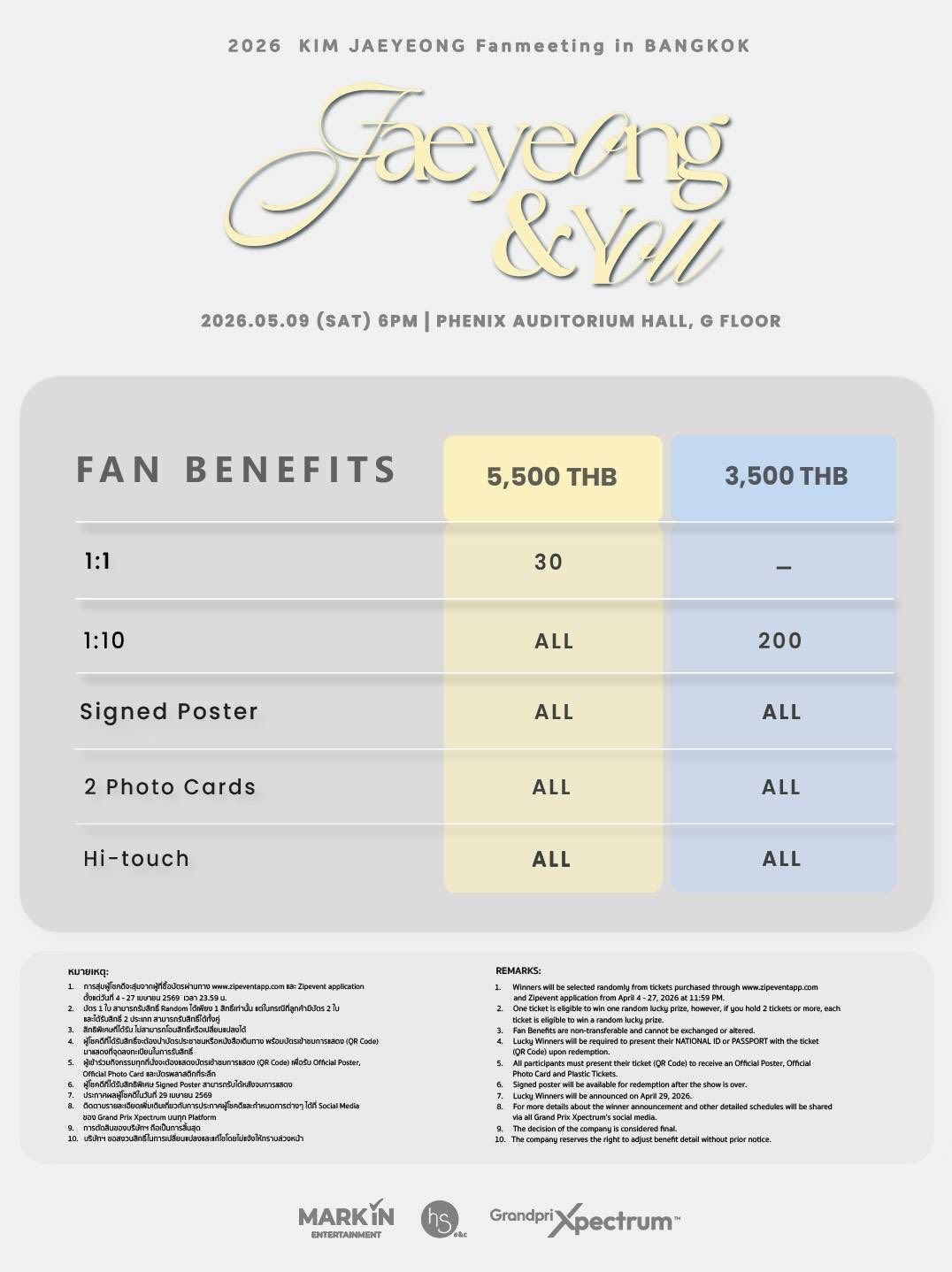 ปักหมุดความฟิน: วันเสาร์ที่ 9 พฤษภาคม 2569 ณ PHENIX Auditorium Hall บัตรราคา 5,500 / 3,500 บาท พร้อม Fan Benefits แบบจัดเต็มทุกที่นั่ง: Hi-touch, โปสเตอร์, โฟโต้การ์ด และของที่ระลึกสุดพิเศษ แถมลุ้นสิทธิ์ใกล้ชิดระดับ 1:1 สำหรับผู้ถือบัตร 5,500 บาท