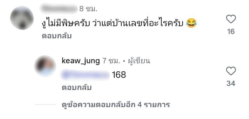 ในขณะที่แฟนคลับรายหนึ่งก็คอมเมนต์ว่า “งูไม่มีพิษครับ ว่าแต่บ้านเลขที่อะไรครับ 😂” งานนี้แม่แก้วเลยบอกว่า “168” แม้จะเป็นคำตอบสั้นๆ แต่บอกเลยชาวหวยถูกใจสิ่งนี้จริงๆ จ้า!!