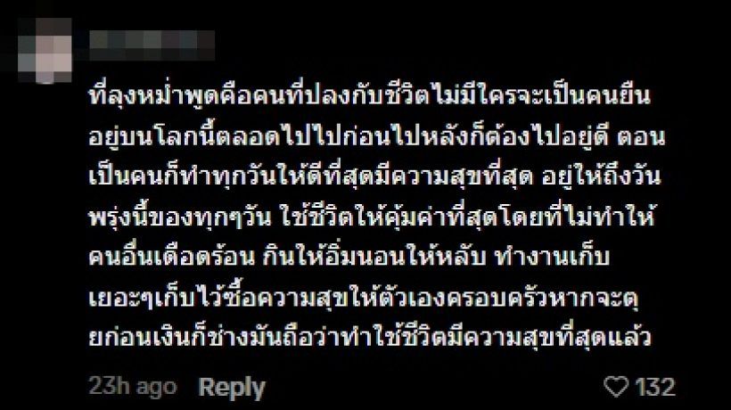 ซึ่งชาวเน็ตได้เข้ามาคอมเมนต์แสดงความคิดเห็นถึงเรื่องนี้มากมาย อาทิ "ไม่ควรพูดแบบนี้ครับ คนโบราณถือ, ไม่น่าพูดแบบนั้น, พี่หม่ำอย่าพูดแบบนี้, ลุงหม่ำอย่าเว้าแบบนั้นครับ ไม่ดี, สัจธรรมของชีวิต พี่หม่ำพูดเรื่องจริง, ที่ลุงหม่ำพูดคือคนที่ปลงกับชีวิต ไม่มีใครจะเป็นคนยืนอยู่บนโลกนี้ตลอดไป ไปก่อนไปหลังก็ต้องไปอยู่ดี"
