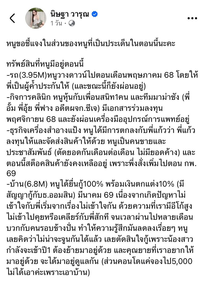 - ทางด้าน โกกิ นิษฐา น้องสาวต่างมารดาของ บิ๊ก ก็ได้ออกโพสต์ข้อความเพื่อชี้แจงเกี่ยวกับทรัพย์สินทั้งหมดของตัวเอง ทั้งหมด