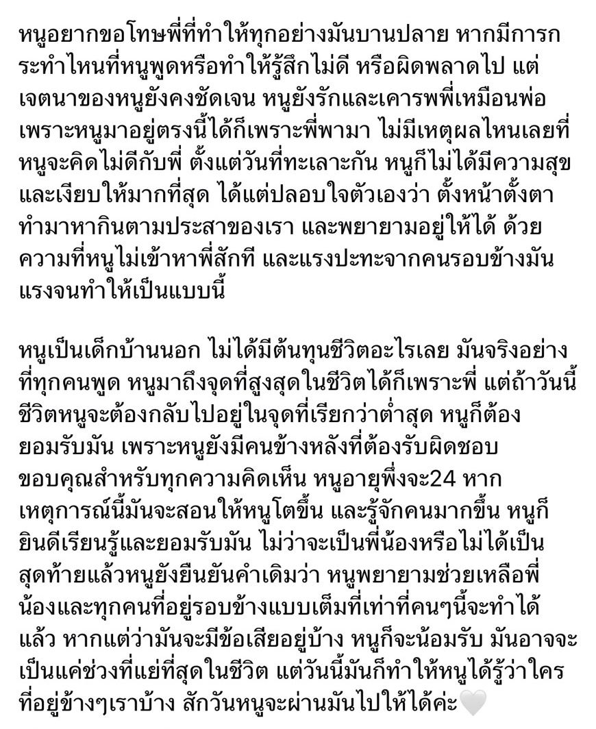 - ขอโทษที่ทำให้เรื่องบานปลาย และเสียใจกับเหตุการณ์ที่เกิดขึ้น ยอมรับว่าตั้งแต่วันที่ทะเลาะกันก็ไม่มีความสุขเลย