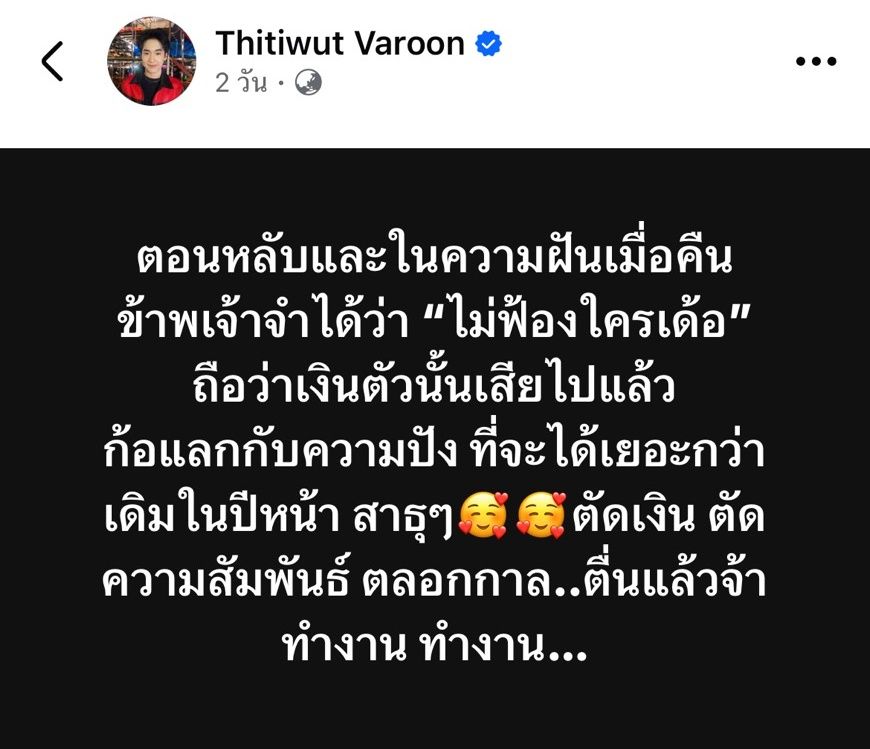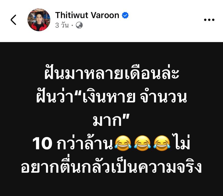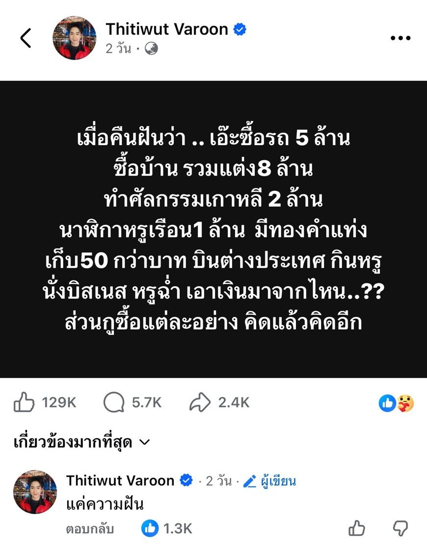 - "เมื่อคืนฝันว่า .. เอ๊ะซื้อรถ 5 ล้าน ซื้อบ้าน รวมแต่ง8 ล้าน ทำศัลกรรมเกาหลี 2 ล้าน นาฬิกาหรูเรือน1 ล้าน มีทองคำแท่งเก็บ50 กว่าบาท บินต่างประเทศ กินหรูนั่งบิสเนส หรูฉ่ำ เอาเงินมาจากไหน..?? ส่วนกูซื้อแต่ละอย่าง คิดแล้วคิดอีก" และโพสต์เพิ่มว่า "ทุกโพสต์ก้อเป็นแค่ความฝัน ฝันที่ไม่อยากตื่นเลย"