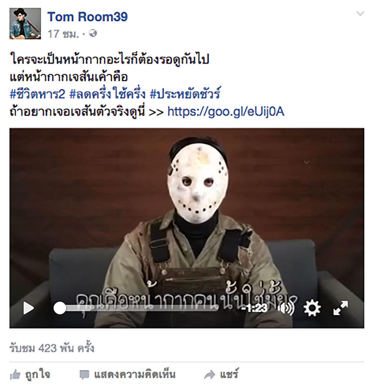 และเมื่อไม่เจอเบาะแสจากอินสตาแกรมส่วนตัว ก็ไปต่อกันที่เฟซบุ๊กของ ทอม ที่ใช้ชื่อว่า Toom Room39 หนุ่มทอมได้โพสต์คลิปก่อนเริ่มรายการไม่กี่ชั่วโมง พร้อมแคปชั่นว่า "ใครเป็นหน้ากากอะไรก็ต้องรอดูกันไป แต่หน้ากากเจสันเค้าคือ #ชีวิตหาร2 #ลดครึ่งใช้ครึ่ง #ประหยัดชัวร์ ถ้าอยากเจอเจสันตัวจริงดูนี่" และหลังจากที่ทอมโพสต์คลิปดังกล่าว ก็มีเหล่าบรรดาแฟนๆ เข้ามาคอมเมนต์อย่างถล่มทลายว่าหนุ่มทอมคือหน้ากากทุเรียนอย่างแน่นอน แต่จะใช้หรือไม่ และทอมใช่คนโพสต์คลิปนี้เองหรือเปล่า อันนี้ก็เกินจะคาดเดาได้