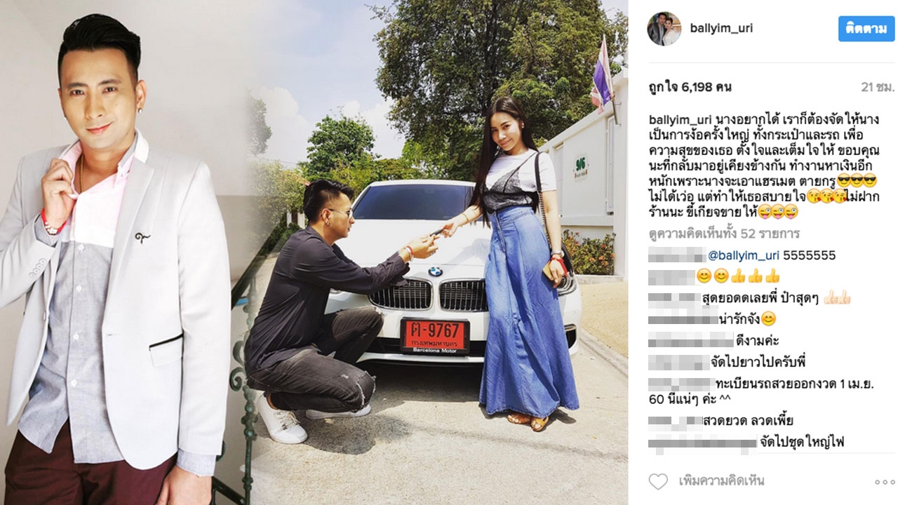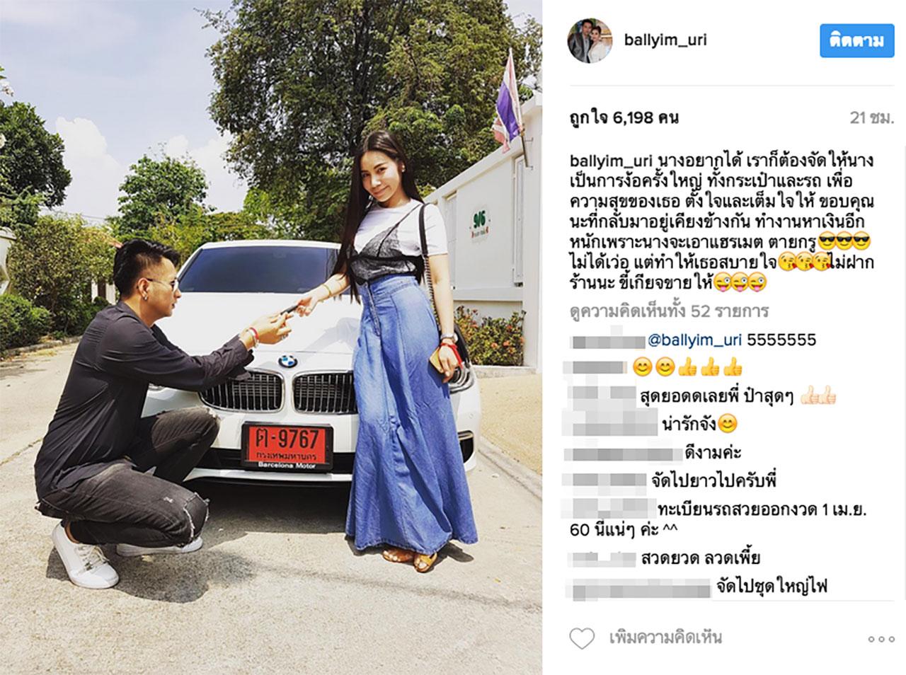 ซึ่งหนุ่มบอลโพสต์รูปพร้อมแคปชั่นว่า "นางอยากได้ เราก็ต้องจัดให้นางเป็นการง้อครั้งใหญ่ ทั้งกระเป๋าและรถ เพื่อความสุขของเธอ ตั้งใจและเต็มใจให้ ขอบคุณนะที่กลับมาอยู่เคียงข้างกัน ทำงานหาเงินอีกหนักเพราะนางจะเอาแอร์เมส ตายกรู ไม่ได้เว่อร์ แต่ทำให้เธอสบายใจ ไม่ฝากร้านนะ ขี้เกียจขายให้"