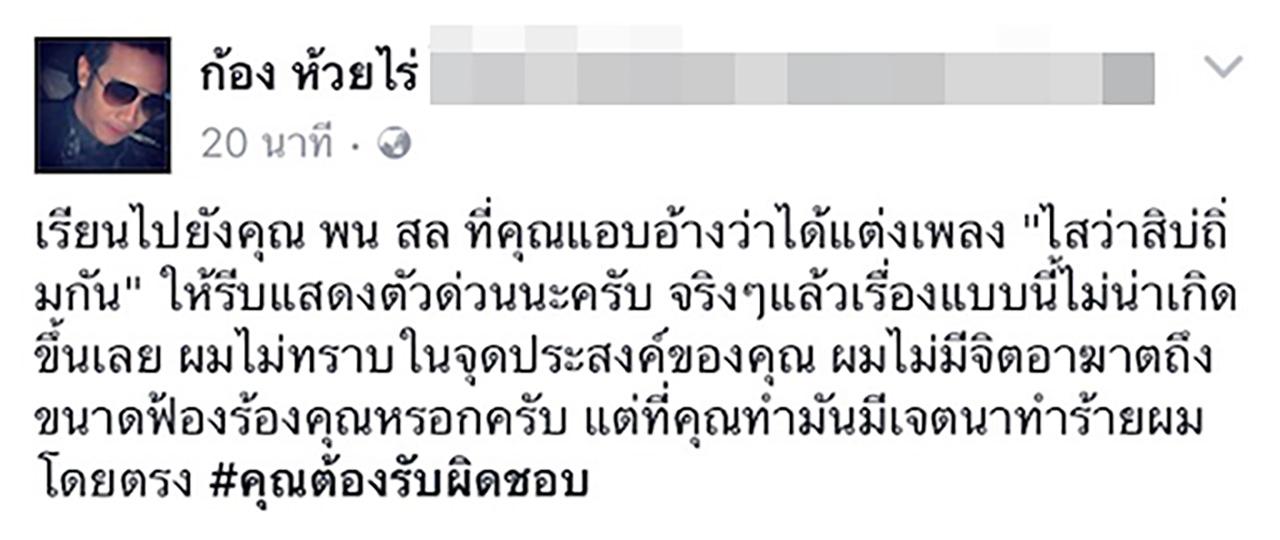 ก้อง ห้วยไร่ โพสต์แรงถึง รปภ.หนุ่มที่แอบอ้างว่าเป็นคนแต่งเพลง ไสว่าสิบ่ถิ่มกัน ให้ออกมาแสดงตัวด่วน เพราะเรื่องนี้ทำร้ายตนโดยตรง ก่อนจะบอกว่าอีกฝ่ายจะต้องรับผิดชอบในเรื่องที่เกิดขึ้นอีกด้วย