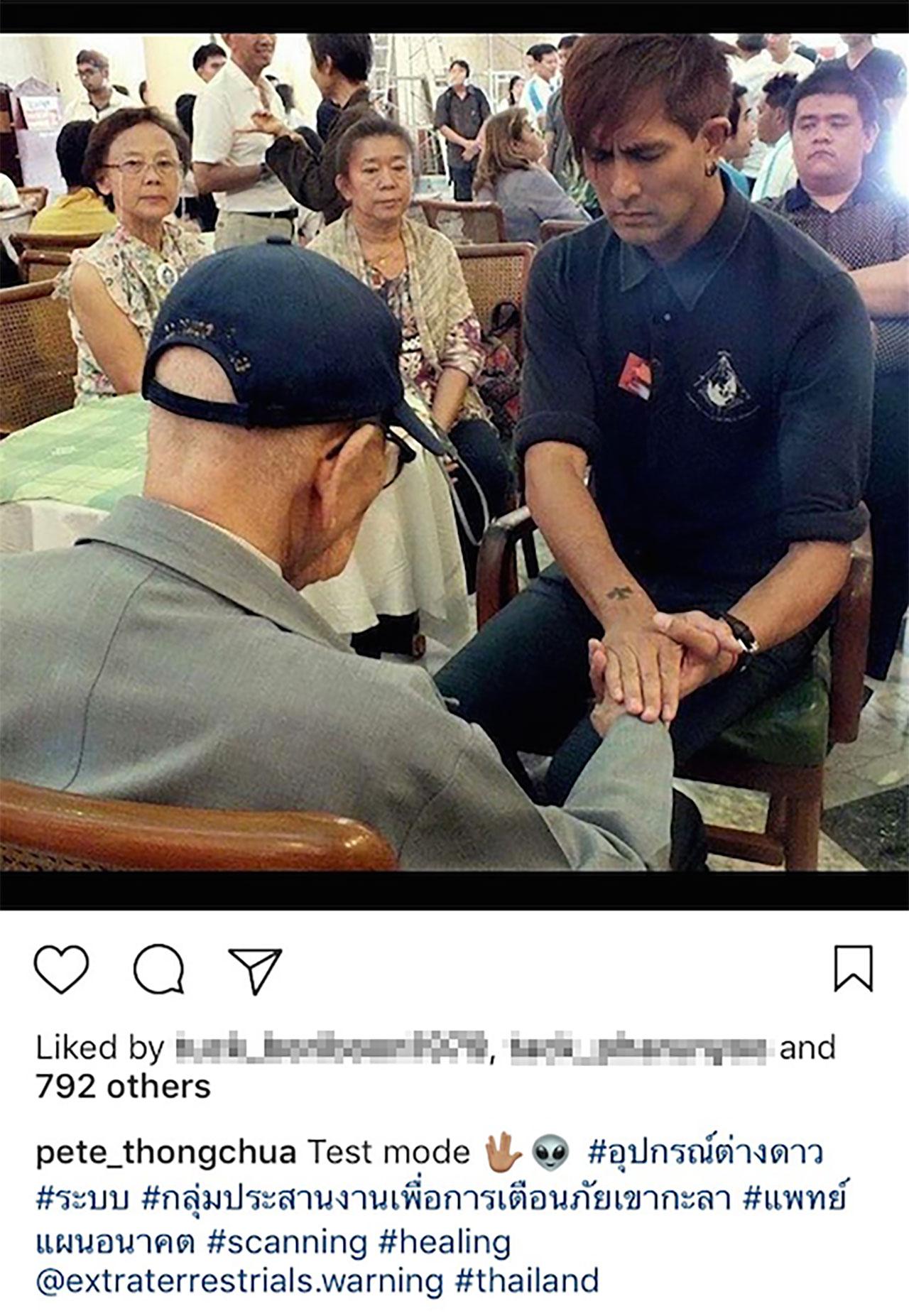 หลังจากที่คุณพ่อลูกสาม พีท ทองเจือ ลงรูปกำลังใช้พลังรักษาคนป่วยในอินสตาแกรมส่วนตัว พร้อมแคปชั่นที่ว่า "Test mode #อุปกรณ์ต่างดาว #ระบบ# กลุ่มประสานงานเพื่อการเตือนภัยเขากะลา #แพทย์แผนอนาคต #scanning #healing @extraterrestrials.warning #thailand"