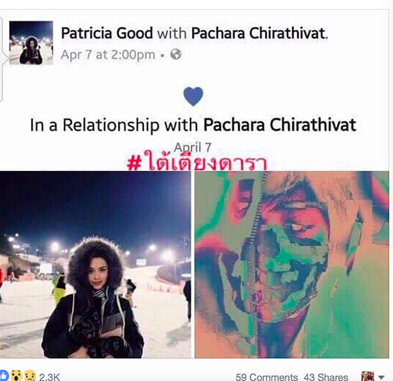 แตกตื่นกันไปทั้งบาง เมื่อนางเอกสาวสายแบ๊ว แพทริเซีย กู๊ด ประกาศผ่านเฟซบุ๊ก ถึงสเตตัส In a Relationship with Pachara Chirathivat งานนี้ไม่ต้องสืบประกาศกันชัดๆ สาวแพท กำลังคบหากับว่า พีช พชร จิราธิวัฒน์
