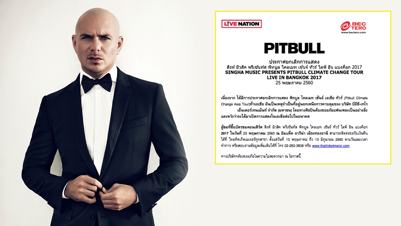 เนื่องจาก ได้มีการประกาศยกเลิกการแสดง พิทบูล ไคลเมท เช้นจ์ เอเชีย ทัวร์ (Pitbull Climate Change Asia Tour) ทั่วเอเชีย อันเป็นเหตุจำเป็นที่อยู่นอกเหนือการควบคุมของ บริษัท บีอีซี-เทโร เอ็นเตอร์เทนเม้นท์ จำกัด (มหาชน) โดยทางศิลปินต้องขออภัยแฟนเพลงเป็นอย่างยิ่ง และหวังว่าจะได้มาเปิดการแสดงในเอเชียต่อไปในอนาคต