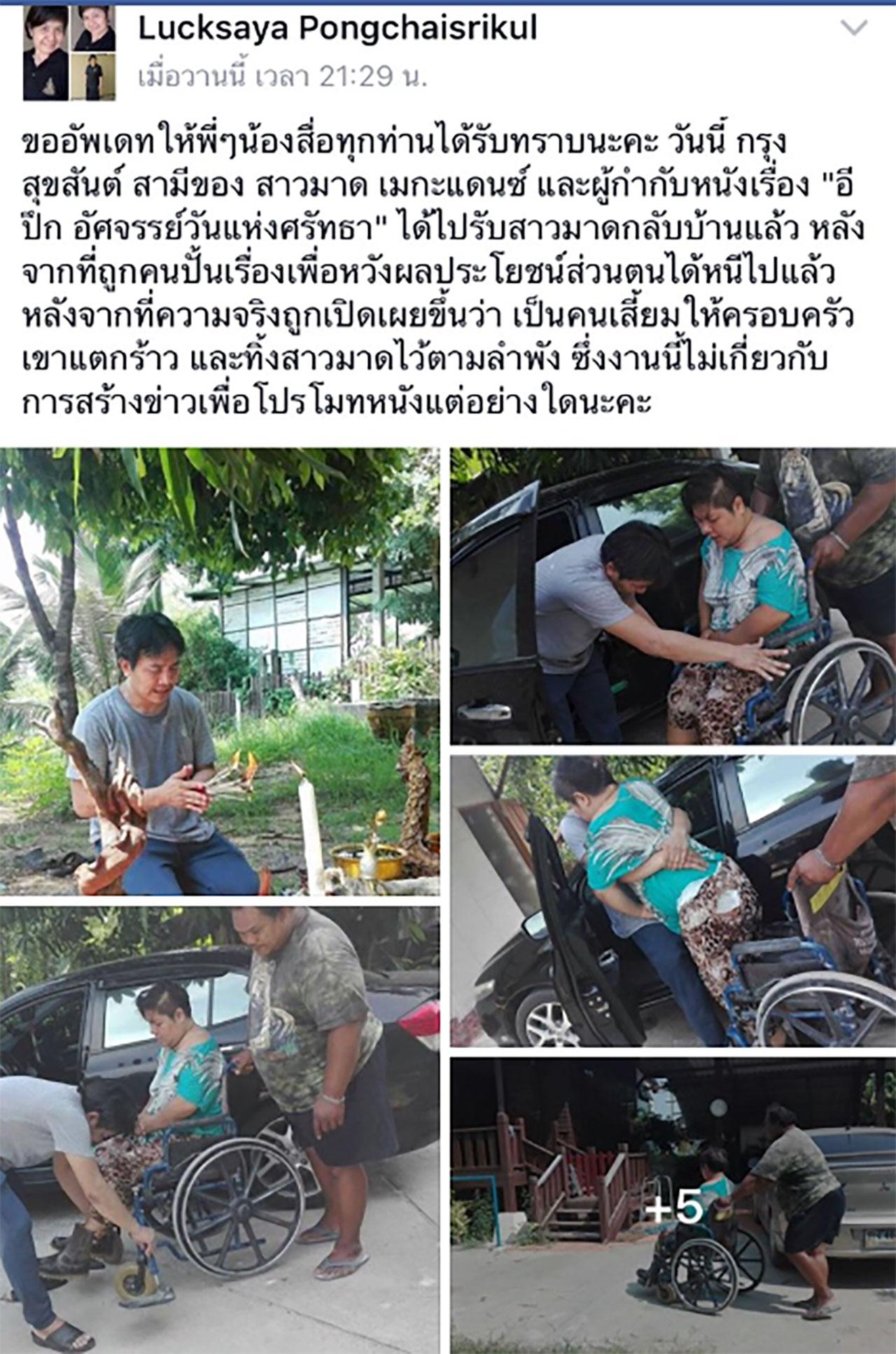 "ขออัพเดตให้พี่ๆ น้องสื่อทุกท่านได้รับทราบนะคะ วันนี้ กรุง สุขสันต์ สามีของ สาวมาด เมกะแดนซ์ และผู้กำกับหนังเรื่อง "อีปึก อัศจรรย์วันแห่งศรัทธา" ได้ไปรับสาวมาดกลับบ้านแล้ว หลังจากที่ถูกคนปั้นเรื่องเพื่อหวังผลประโยชน์ส่วนตนได้หนีไปแล้ว หลังจากที่ความจริงถูกเปิดเผยขึ้นว่า เป็นคนเสี้ยมให้ครอบครัวเขาแตกร้าว และทิ้งสาวมาดไว้ตามลำพัง ซึ่งงานนี้ไม่เกี่ยวกับการสร้างข่าวเพื่อโปรโมตหนังแต่อย่างใดนะคะ"