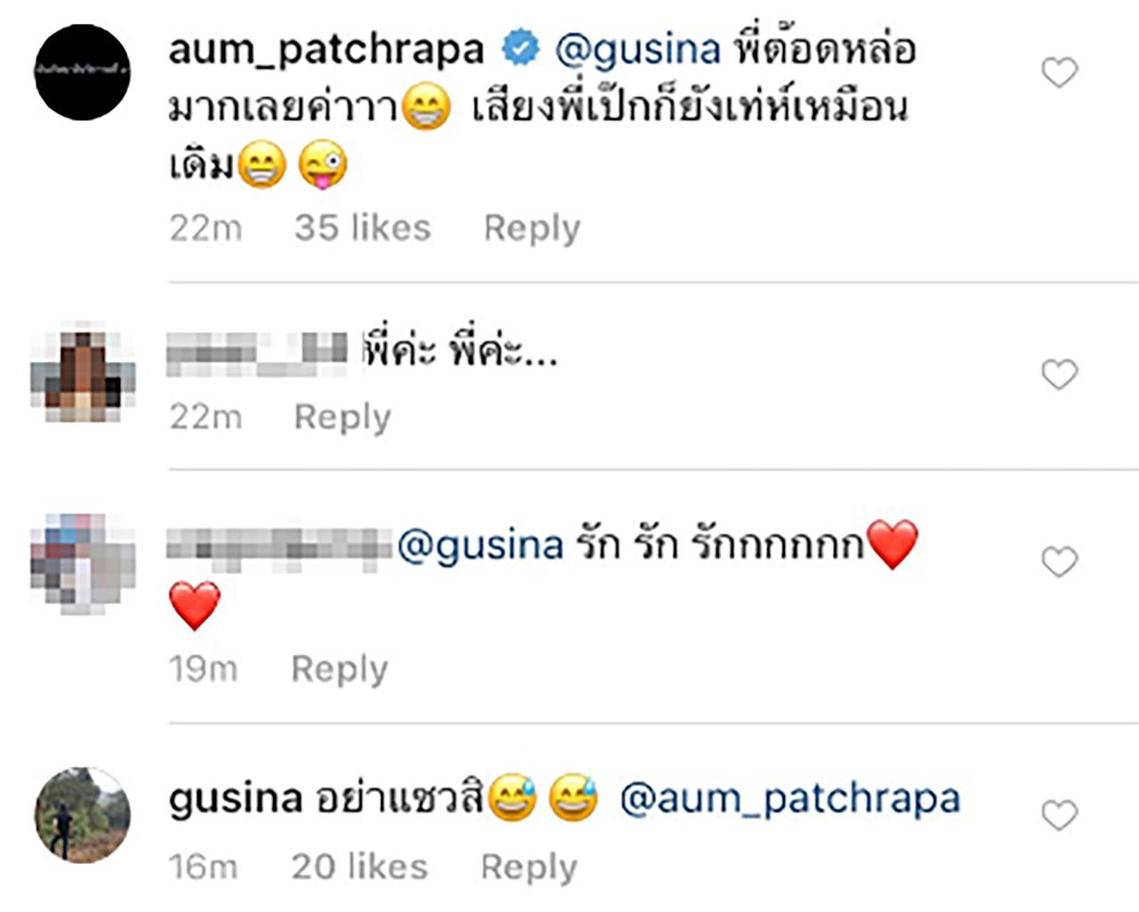 โดย อั้ม แท็กรูป ต๊อด ในมิวสิกวิดีโอที่เล่น ก่อนจะแท็กคอมเมนต์ไปหาว่า "พี่ต๊อดหล่อมากเลยคร่า เสียงพี่เป๊กก็ยังเท่เหมือนเดิม" ซึ่ง ต๊อด ก็ตอบกลับมา "อย่าแซวสิ"