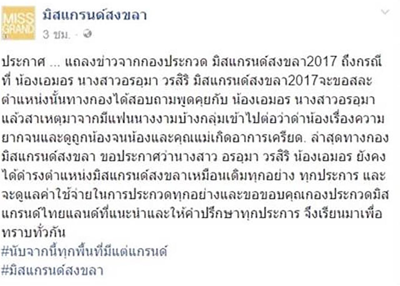หลังจากที่มีกระแสดราม่าของวงการประกวดมิสแกรนด์สงขลา ปี 2017 ซึ่งผู้ที่ได้รับรางวัลคือ น้องเอมอร อรอุมา วรสิริ ซึ่งถูกคนในโลกโซเชียลกระหน่ำด่าจนเจ้าตัวเกิดความเครียดเรื่องฐานะความยากจน ถึงกับมีข่าวลือออกมาว่า น้องเอมอร อาจจะสละตำแหน่ง หรือทางกองประกวดจะปลดน้องเอมอรออกจากตำแหน่งนั้น ทางกองประกวดได้ยืนยันแล้วว่าข่าวลือดังกล่าวไม่เป็นความจริงอย่างแน่นอน