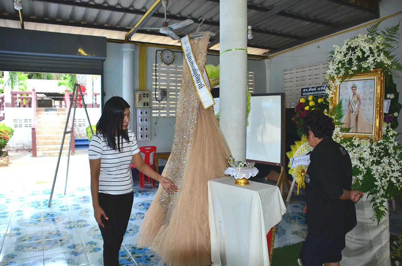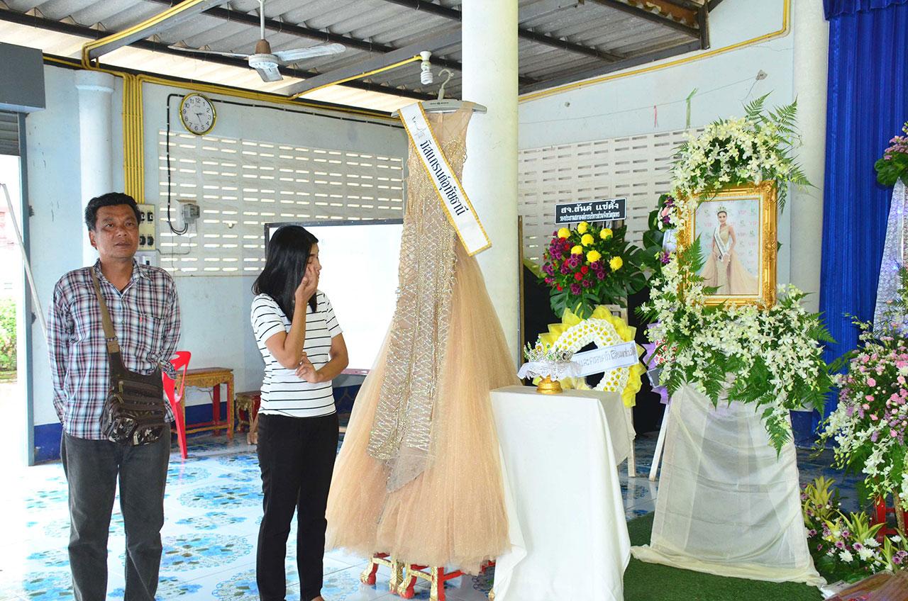 โดยมี นายวิชาญ พาหาสิงห์ อายุ 50 ปี ผู้เป็นลุงที่เลี้ยงดูมาแต่แบเบาะ กับ นางรจนา พาหาสิงห์ อายุ 41 ปี แม่ของนางสาวรัตนายืนดูรูปหน้าศพ และลูบคลำมุงกุฎกับชุดมิสแกรนด์อุทัยธานี ที่ประดับอยู่ข้างๆ ด้วยน้ำตาคลอเบ้า